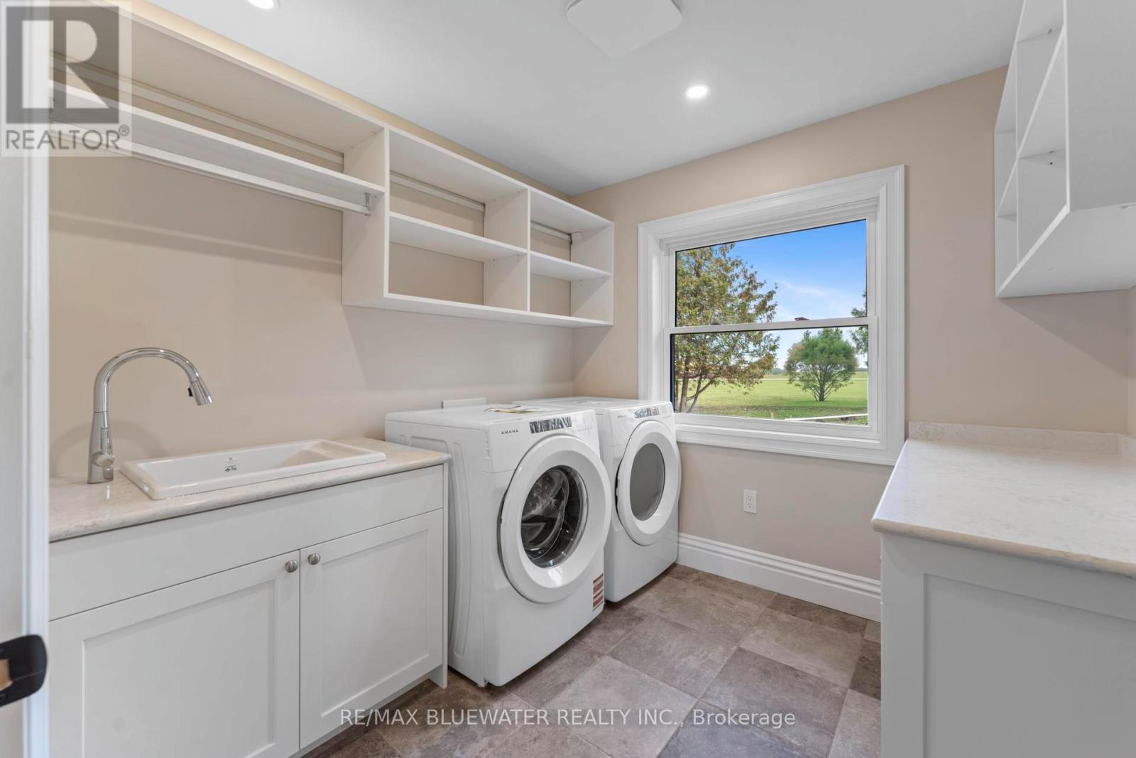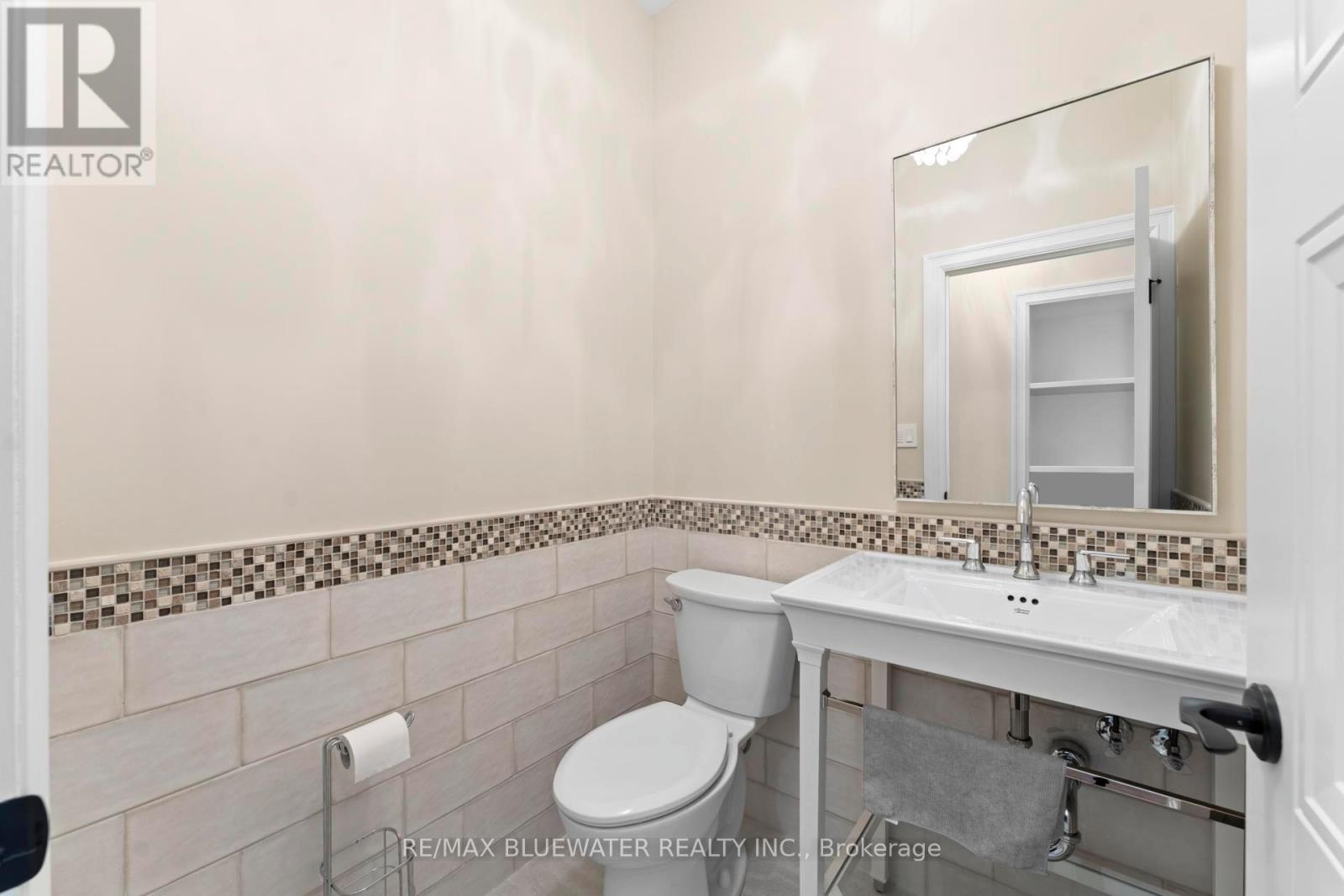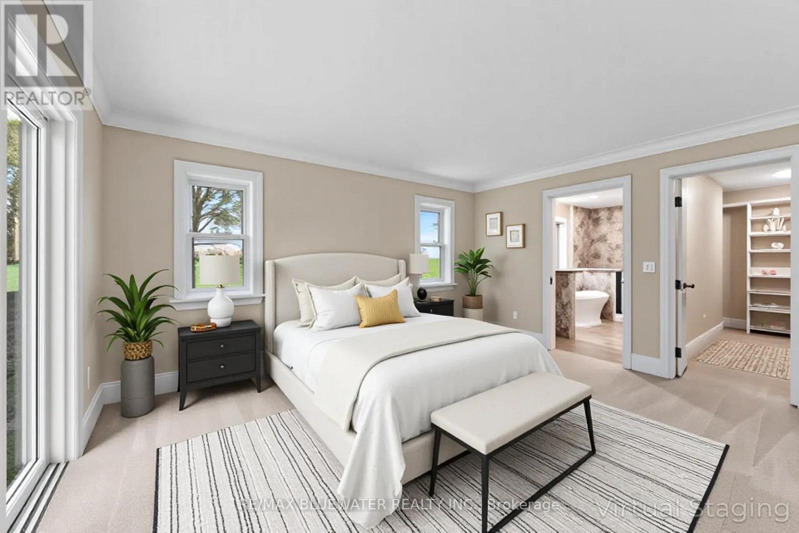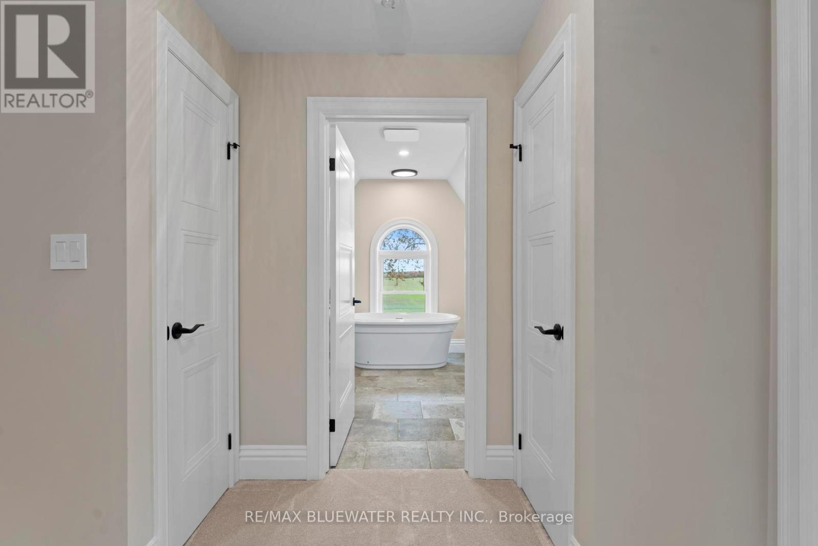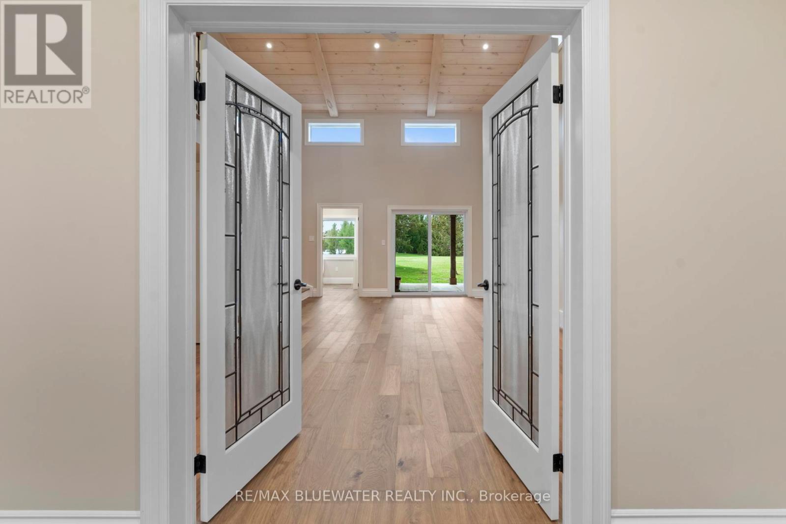 Experience refined country living in this fully renovated brick estate, where modern sophistication meets timeless elegance. Set on a show-stopping 1.6-acre lot, this home has been meticulously redesigned with an uncompromising commitment to quality and style-no detail has been overlooked. Featuring three spacious bedrooms and two and a half luxurious bathrooms, the residence offers a main-level primary suite with a spa-inspired five-piece ensuite, a four-piece bath upstairs, and a stylish two-piece powder room for guests. The lower level provides flexibility for additional bedrooms and a bathroom if desired, and includes a drywalled recreation space ready to finish to your personal taste. The gourmet eat-in kitchen is a true showpiece, adorned with quartz countertops, new high-end appliances, custom cabinetry and finishes, and a spacious pantry. Just beyond, the inviting living room centers around a charming fireplace and features an elegant coffered ceiling, creating the perfect ambiance for both quiet evenings and sophisticated entertaining. The mudroom adds everyday convenience and leads into the jaw-dropping great room, showcasing hardwood floors, 18-foot shiplap cathedral ceilings, and a stunning custom staircase. The main-floor laundry room is equally impressive-spacious, functional, and beautifully designed. No detail has been spared: a new septic system, drilled well, metal roof, furnace, central air, insulation, and fully updated mechanical systems-among many other improvements-ensure total comfort and peace of mind. Step outside to your covered front porch, finished with durable composite decking, and enjoy serene views of Lake Huron shimmering on the horizon. Whether you're sipping coffee at sunrise or hosting guests at sunset, the setting is truly breathtaking. Located just minutes from Bayfield, this home offers the perfect blend of tranquility, luxury, and convenience. Discover where elegance meets the countryside-schedule your private tour today. (id:51300)