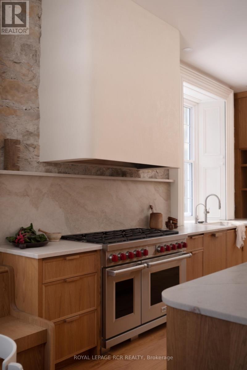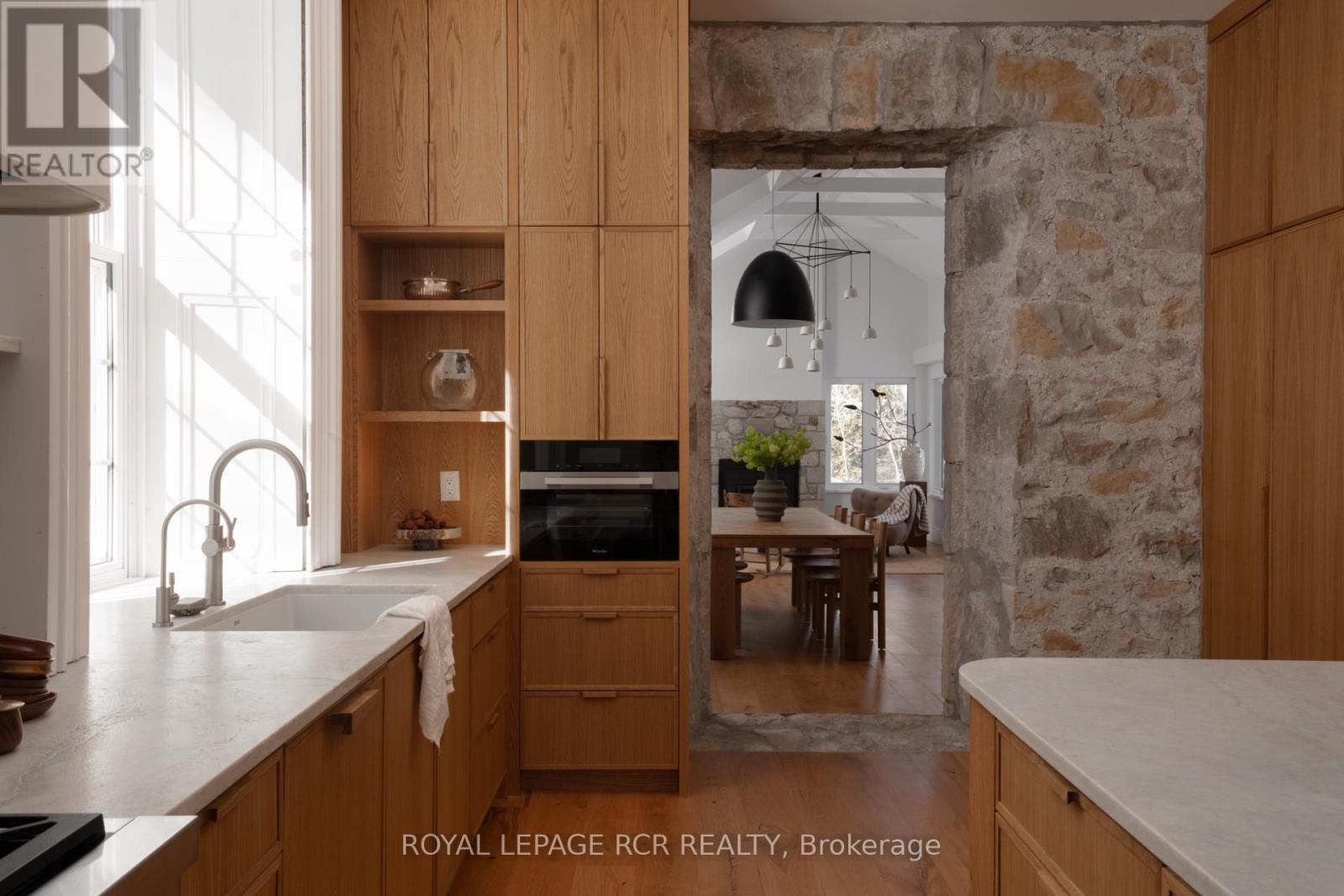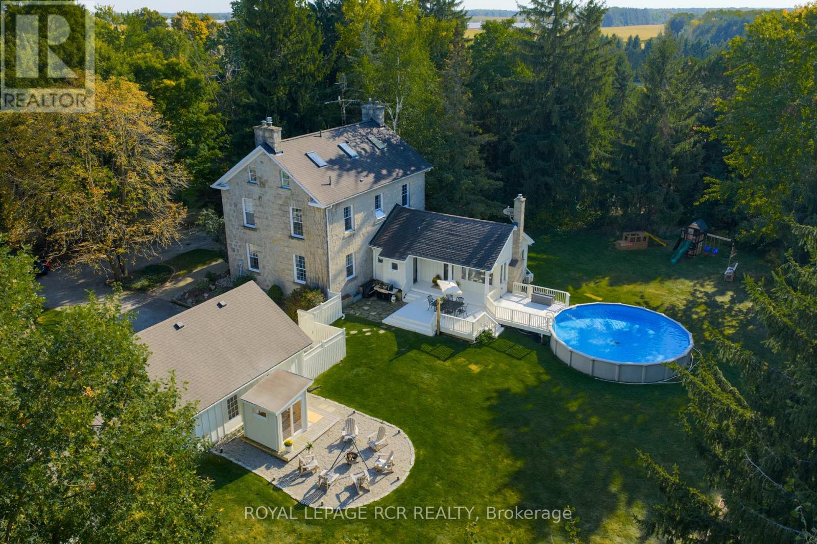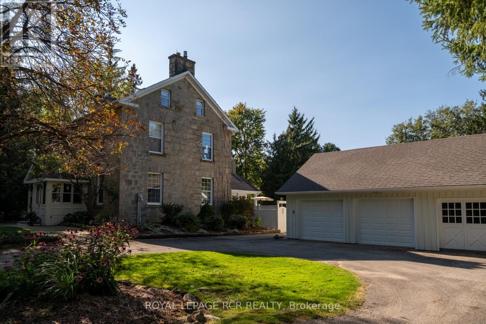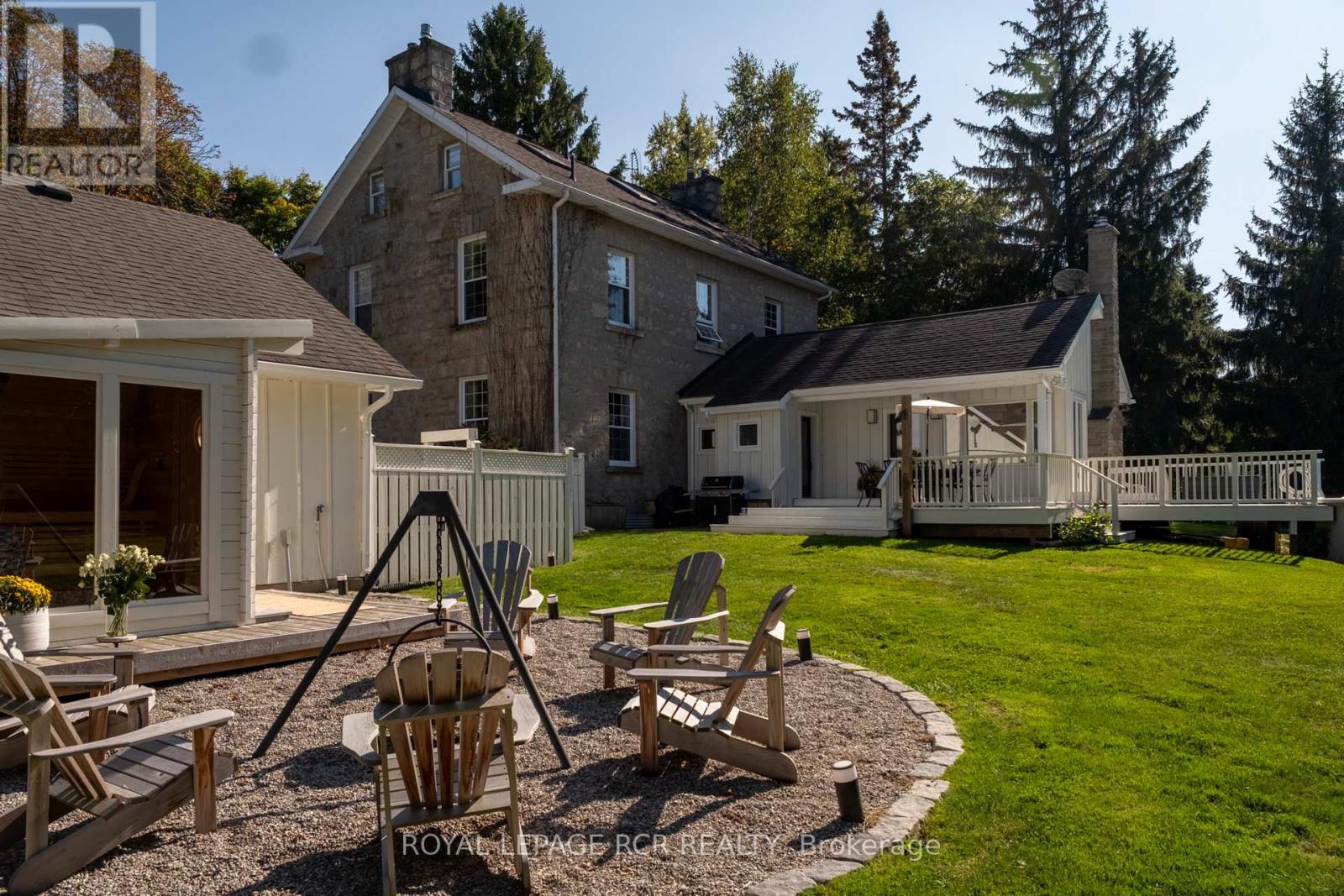 Historic soul meets a high-design heartbeat. Welcome to Stonecrop, an iconic 1857 stone manor reimagined as a warm, soulful sanctuary. Just outside of Elora, set on nearly 10 private acres at the end of a dramatic tree-lined driveway, this is a rare dialogue between historic provenance and refined organic luxury. Inside, soaring 12-foot ceilings, original plaster medallions, and dramatic stone walls create an inviting, layered atmosphere. At the heart of the home, a show-stopping kitchen, recently featured in Architectural Digest (!!!), anchors daily life and entertaining. Rooted in timeless design, it blends heritage architecture with modern precision through custom wood cabinetry, integrated top-tier appliances, and natural materials in balance. The living and dining areas continue the story, where a stone fireplace is set beneath vaulted ceilings, and skylights that flood the space with light. The main level also offers a family room, dreamy private office, and magazine worthy powder room. Upstairs, 5 spacious bedrooms span 2 levels, each defined by natural light and quiet luxury. The second floor features wide-plank wood flooring, 3 large bedrooms, and a beautifully appointed 4-piece bath. The third floor is fully finished with vaulted ceilings, exposed beams, 2 additional bedrooms, a sitting area, and a 3-piece bath. The partially finished basement offers in-law suite potential with a large bedroom, kitchenette rough-in, 4-piece bath, and separate entrance. Geothermal heating supports the home with modern efficiency. Outdoors, a heated above-ground pool, outdoor sauna, fire pit lounge, and outdoor pizza kitchen set the tone for unforgettable summers. An orchard, gardens, and private trails wind through nearly 10 acres of countryside. The impressive 58-foot detached garage includes a dedicated home gym and ample space for cars, toys, and equipment, completing this private country compound. AD-worthy interiors. Expansive acreage. Stonecrop is iconic. (id:51300)