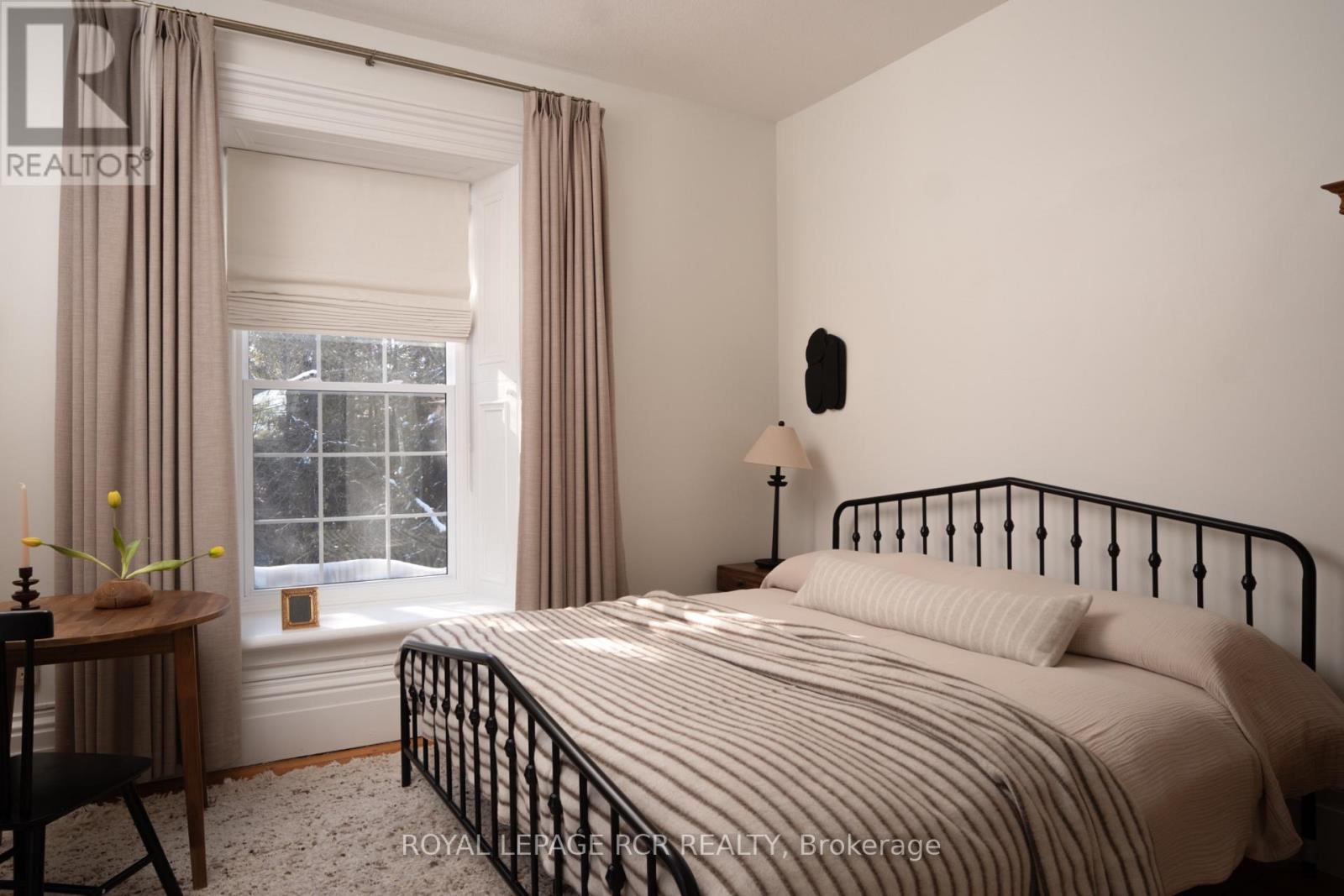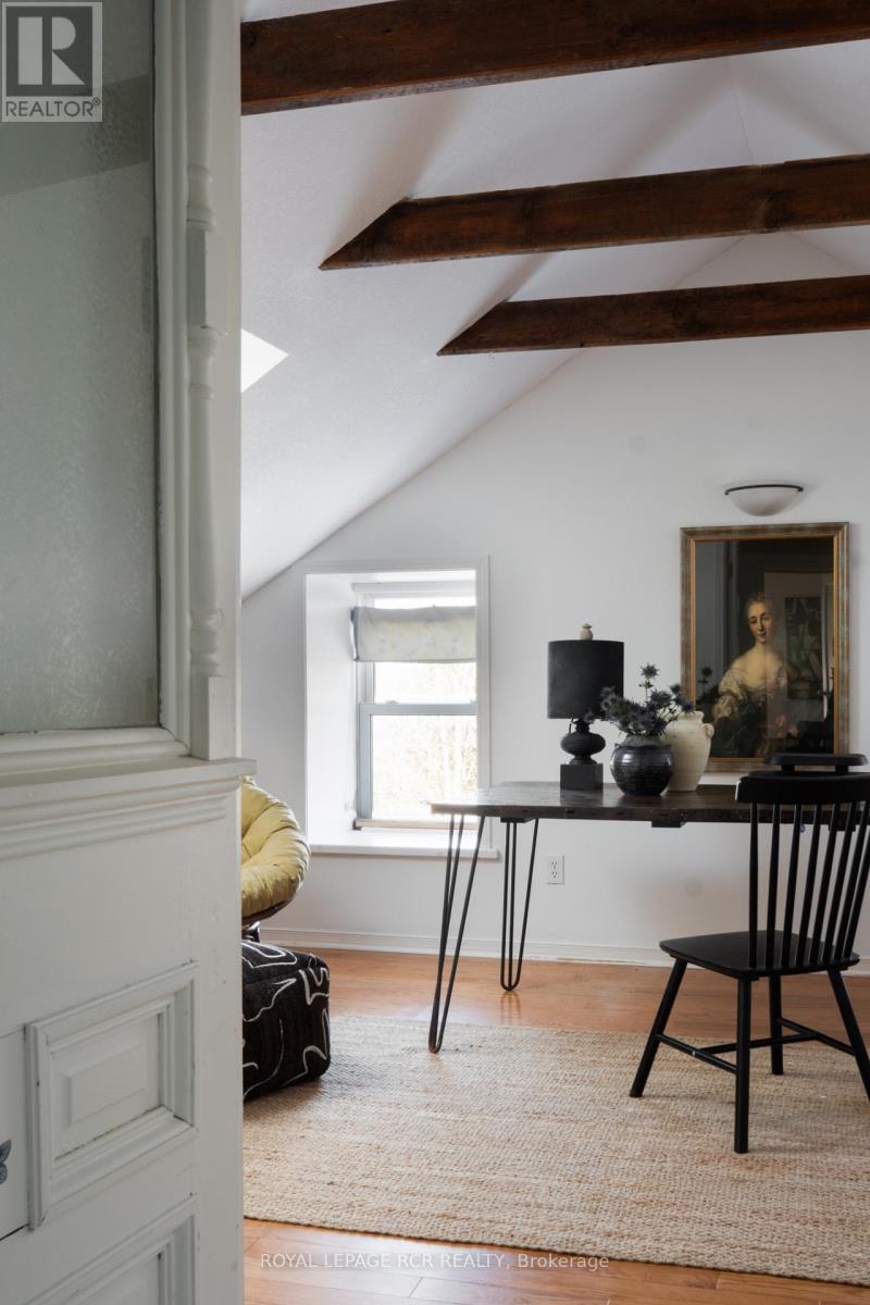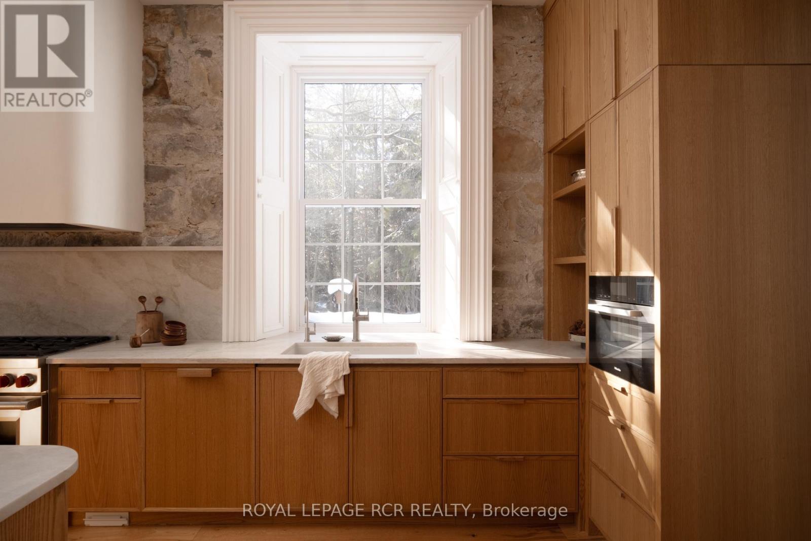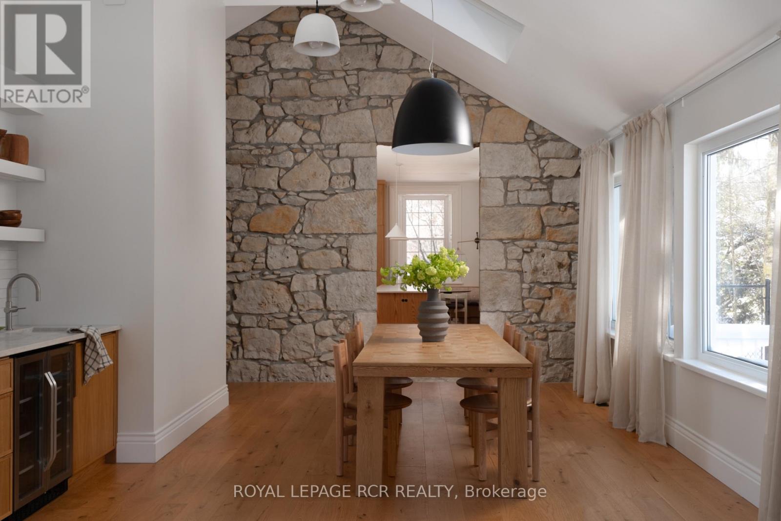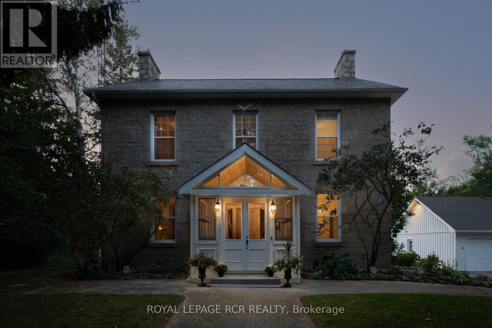 Historic soul meets a high-design heartbeat. Welcome to Stonecrop, an iconic 1857 stone manor reimagined as a warm, soulful sanctuary. Just outside of Elora, set on nearly 10 private acres at the end of a dramatic tree-lined driveway, this is a rare dialogue between historic provenance and refined organic luxury. Inside, soaring 12-foot ceilings, original plaster medallions, and dramatic stone walls create an inviting, layered atmosphere. At the heart of the home, a show-stopping kitchen, recently featured in Architectural Digest (!!!), anchors daily life and entertaining. Rooted in timeless design, it blends heritage architecture with modern precision through custom wood cabinetry, integrated top-tier appliances, and natural materials in balance. The living and dining areas continue the story, where a stone fireplace is set beneath vaulted ceilings, and skylights that flood the space with light. The main level also offers a family room, dreamy private office, and magazine worthy powder room. Upstairs, 5 spacious bedrooms span 2 levels, each defined by natural light and quiet luxury. The second floor features wide-plank wood flooring, 3 large bedrooms, and a beautifully appointed 4-piece bath. The third floor is fully finished with vaulted ceilings, exposed beams, 2 additional bedrooms, a sitting area, and a 3-piece bath. The partially finished basement offers in-law suite potential with a large bedroom, kitchenette rough-in, 4-piece bath, and separate entrance. Geothermal heating supports the home with modern efficiency. Outdoors, a heated above-ground pool, outdoor sauna, fire pit lounge, and outdoor pizza kitchen set the tone for unforgettable summers. An orchard, gardens, and private trails wind through nearly 10 acres of countryside. The impressive 58-foot detached garage includes a dedicated home gym and ample space for cars, toys, and equipment, completing this private country compound. AD-worthy interiors. Expansive acreage. Stonecrop is iconic. (id:51300)