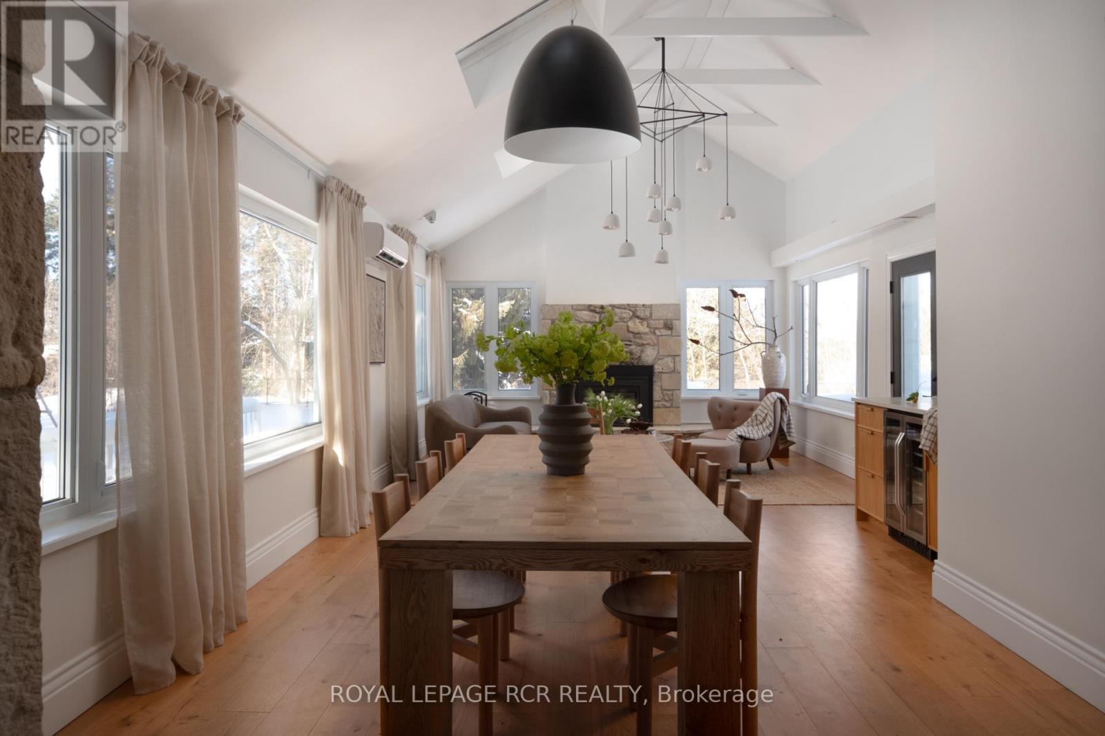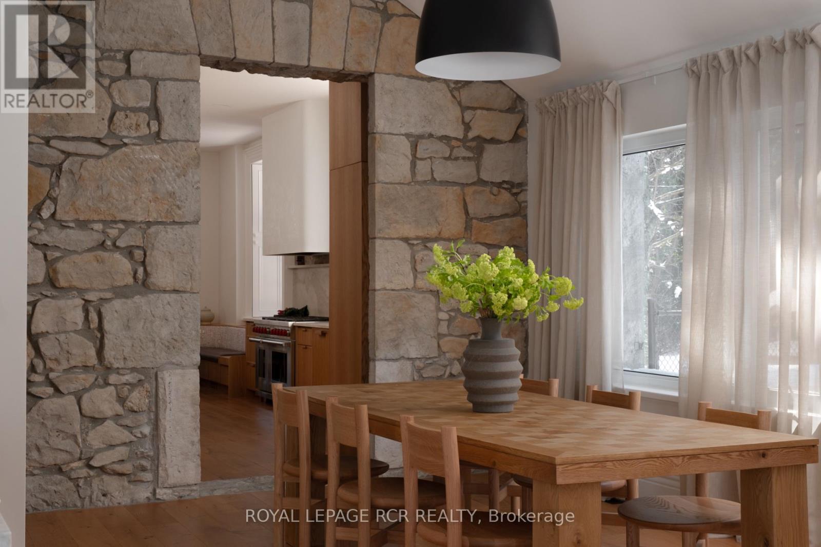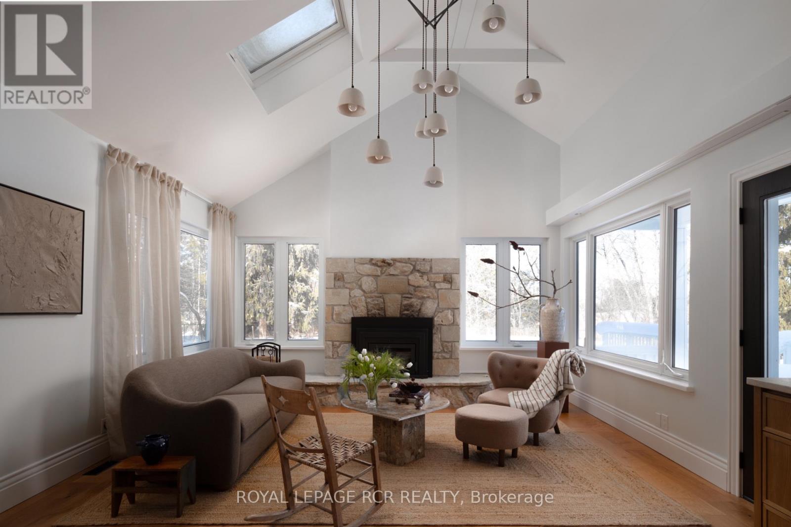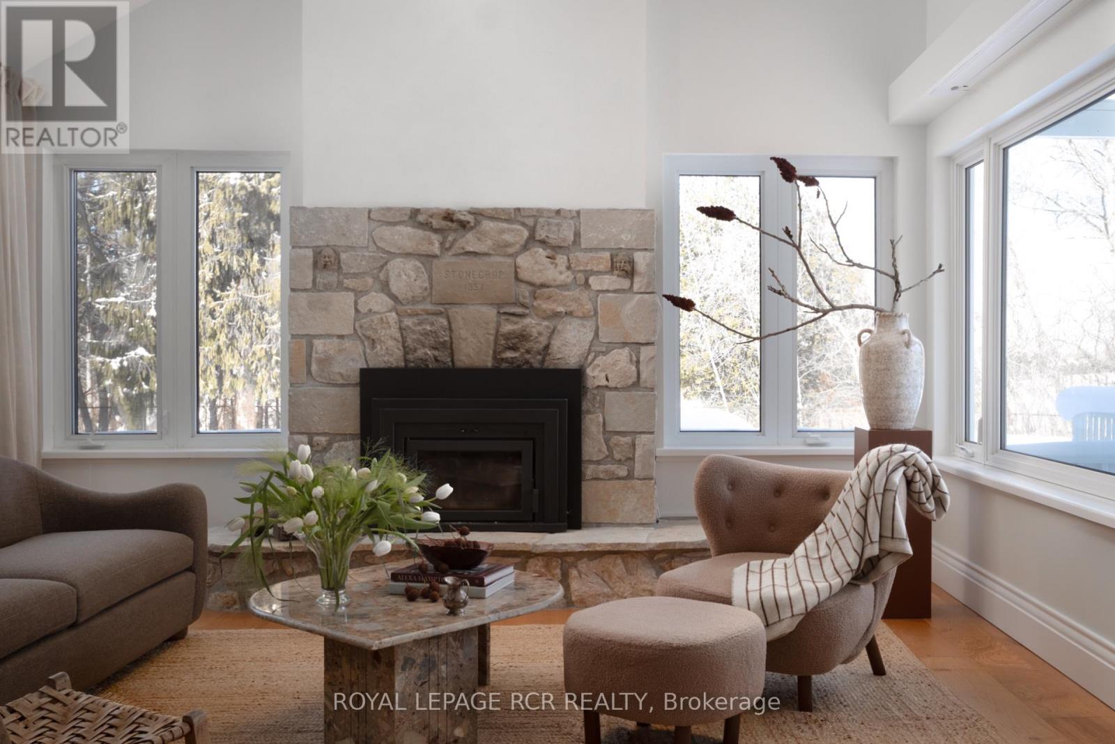 Historic soul meets a high-design heartbeat. Welcome to Stonecrop, an iconic 1857 stone manor reimagined as a warm, soulful sanctuary. Just outside of Elora, set on nearly 10 private acres at the end of a dramatic tree-lined driveway, this is a rare dialogue between historic provenance and refined organic luxury. Inside, soaring 12-foot ceilings, original plaster medallions, and dramatic stone walls create an inviting, layered atmosphere. At the heart of the home, a show-stopping kitchen, recently featured in Architectural Digest (!!!), anchors daily life and entertaining. Rooted in timeless design, it blends heritage architecture with modern precision through custom wood cabinetry, integrated top-tier appliances, and natural materials in balance. The living and dining areas continue the story, where a stone fireplace is set beneath vaulted ceilings, and skylights that flood the space with light. The main level also offers a family room, dreamy private office, and magazine worthy powder room. Upstairs, 5 spacious bedrooms span 2 levels, each defined by natural light and quiet luxury. The second floor features wide-plank wood flooring, 3 large bedrooms, and a beautifully appointed 4-piece bath. The third floor is fully finished with vaulted ceilings, exposed beams, 2 additional bedrooms, a sitting area, and a 3-piece bath. The partially finished basement offers in-law suite potential with a large bedroom, kitchenette rough-in, 4-piece bath, and separate entrance. Geothermal heating supports the home with modern efficiency. Outdoors, a heated above-ground pool, outdoor sauna, fire pit lounge, and outdoor pizza kitchen set the tone for unforgettable summers. An orchard, gardens, and private trails wind through nearly 10 acres of countryside. The impressive 58-foot detached garage includes a dedicated home gym and ample space for cars, toys, and equipment, completing this private country compound. AD-worthy interiors. Expansive acreage. Stonecrop is iconic. (id:51300)