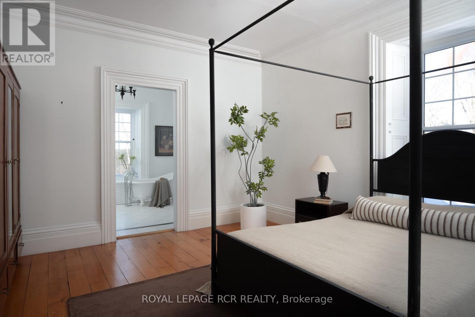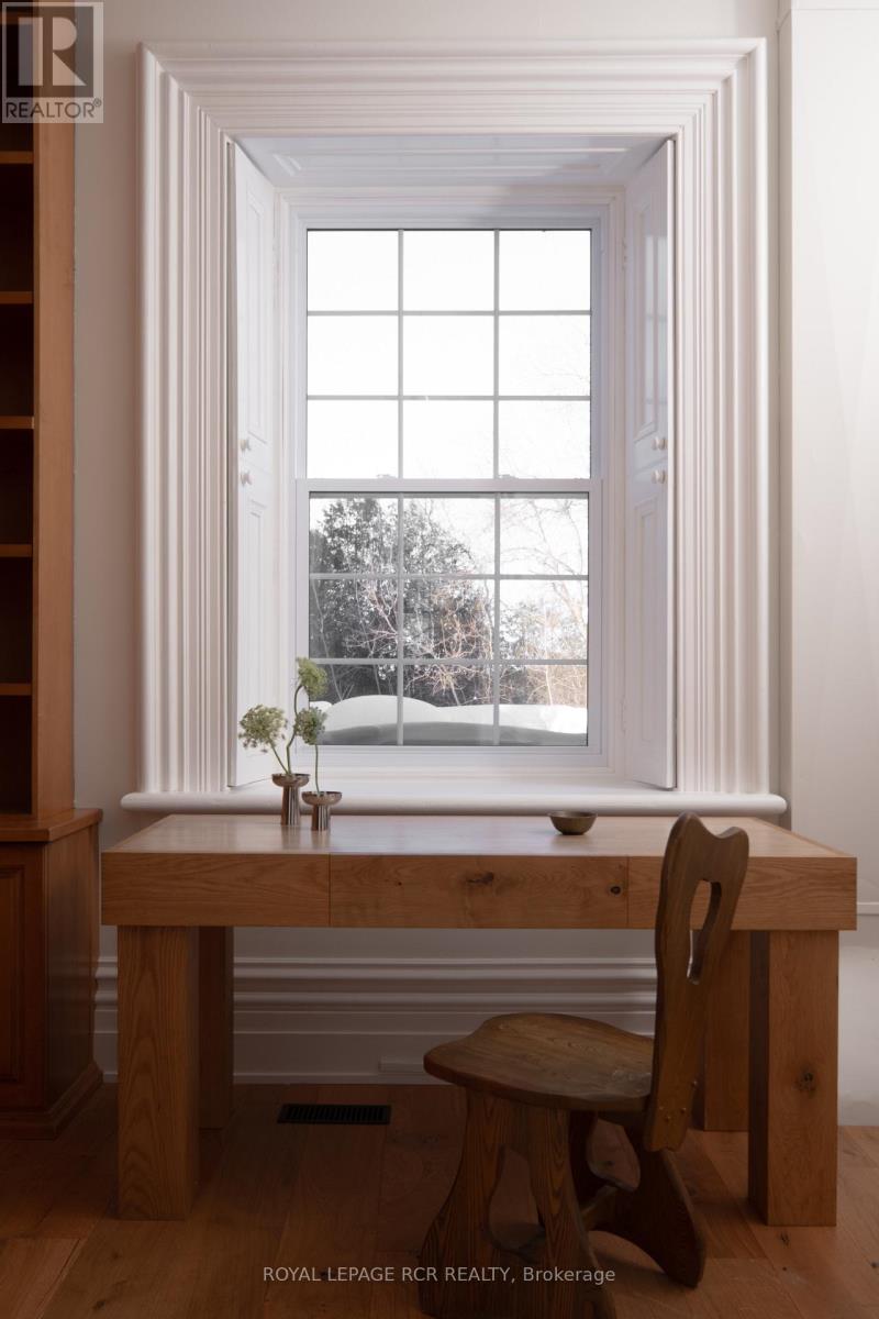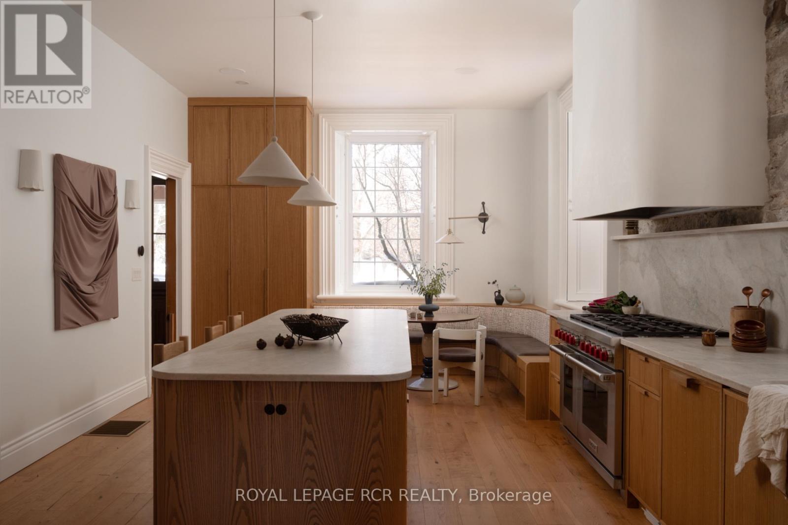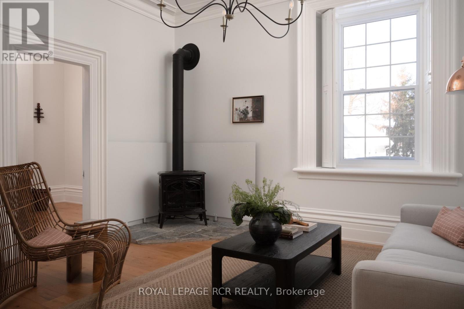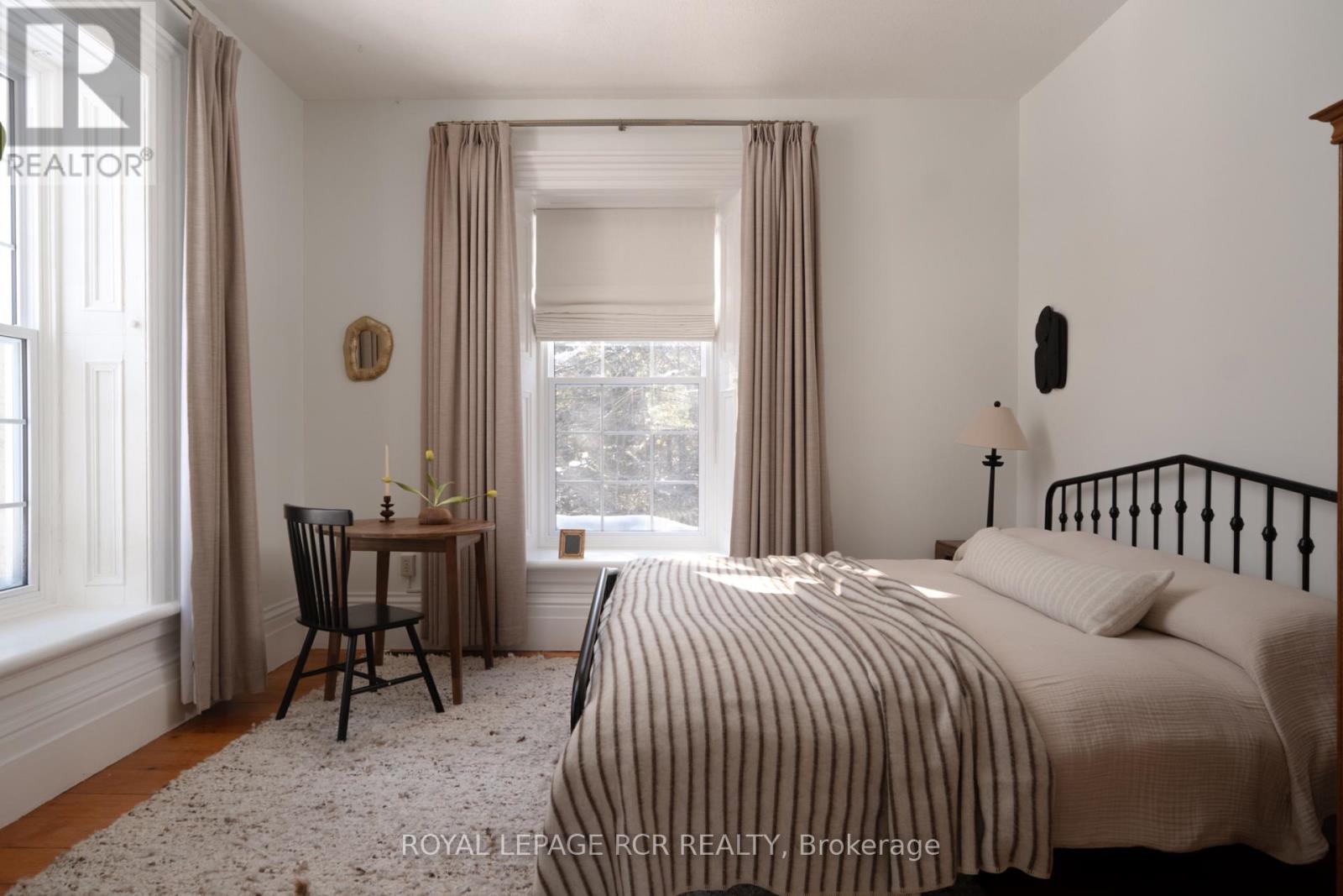 Historic soul meets a high-design heartbeat. Welcome to Stonecrop, an iconic 1857 stone manor reimagined as a warm, soulful sanctuary. Just outside of Elora, set on nearly 10 private acres at the end of a dramatic tree-lined driveway, this is a rare dialogue between historic provenance and refined organic luxury. Inside, soaring 12-foot ceilings, original plaster medallions, and dramatic stone walls create an inviting, layered atmosphere. At the heart of the home, a show-stopping kitchen, recently featured in Architectural Digest (!!!), anchors daily life and entertaining. Rooted in timeless design, it blends heritage architecture with modern precision through custom wood cabinetry, integrated top-tier appliances, and natural materials in balance. The living and dining areas continue the story, where a stone fireplace is set beneath vaulted ceilings, and skylights that flood the space with light. The main level also offers a family room, dreamy private office, and magazine worthy powder room. Upstairs, 5 spacious bedrooms span 2 levels, each defined by natural light and quiet luxury. The second floor features wide-plank wood flooring, 3 large bedrooms, and a beautifully appointed 4-piece bath. The third floor is fully finished with vaulted ceilings, exposed beams, 2 additional bedrooms, a sitting area, and a 3-piece bath. The partially finished basement offers in-law suite potential with a large bedroom, kitchenette rough-in, 4-piece bath, and separate entrance. Geothermal heating supports the home with modern efficiency. Outdoors, a heated above-ground pool, outdoor sauna, fire pit lounge, and outdoor pizza kitchen set the tone for unforgettable summers. An orchard, gardens, and private trails wind through nearly 10 acres of countryside. The impressive 58-foot detached garage includes a dedicated home gym and ample space for cars, toys, and equipment, completing this private country compound. AD-worthy interiors. Expansive acreage. Stonecrop is iconic. (id:51300)