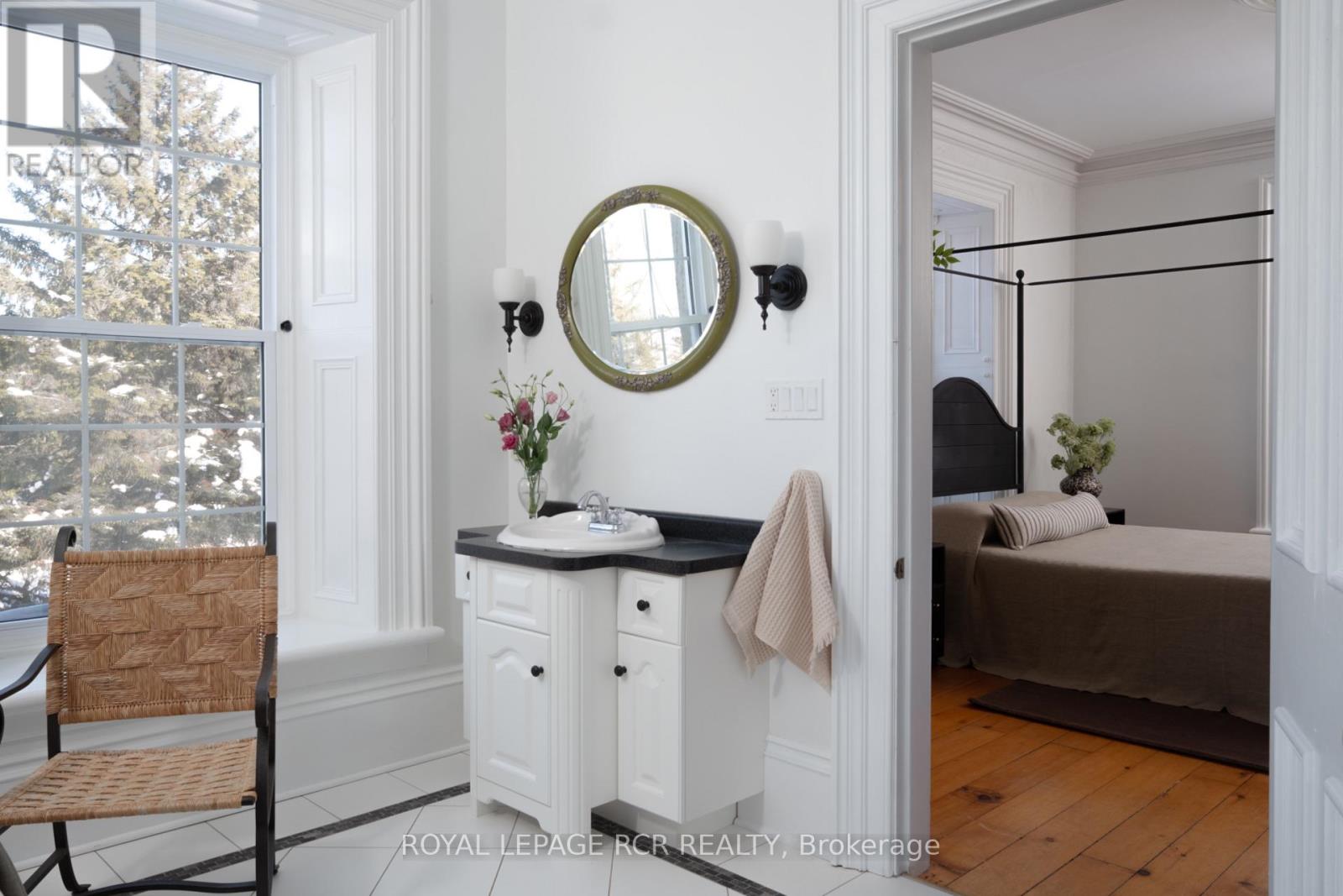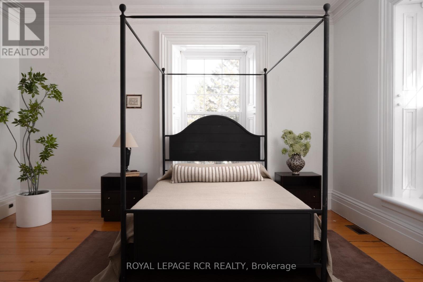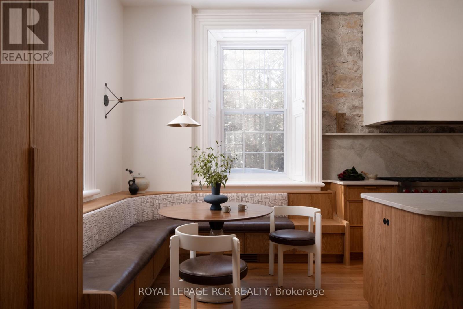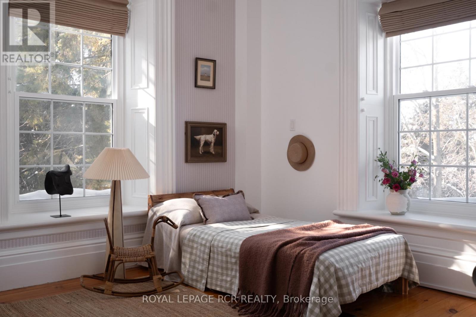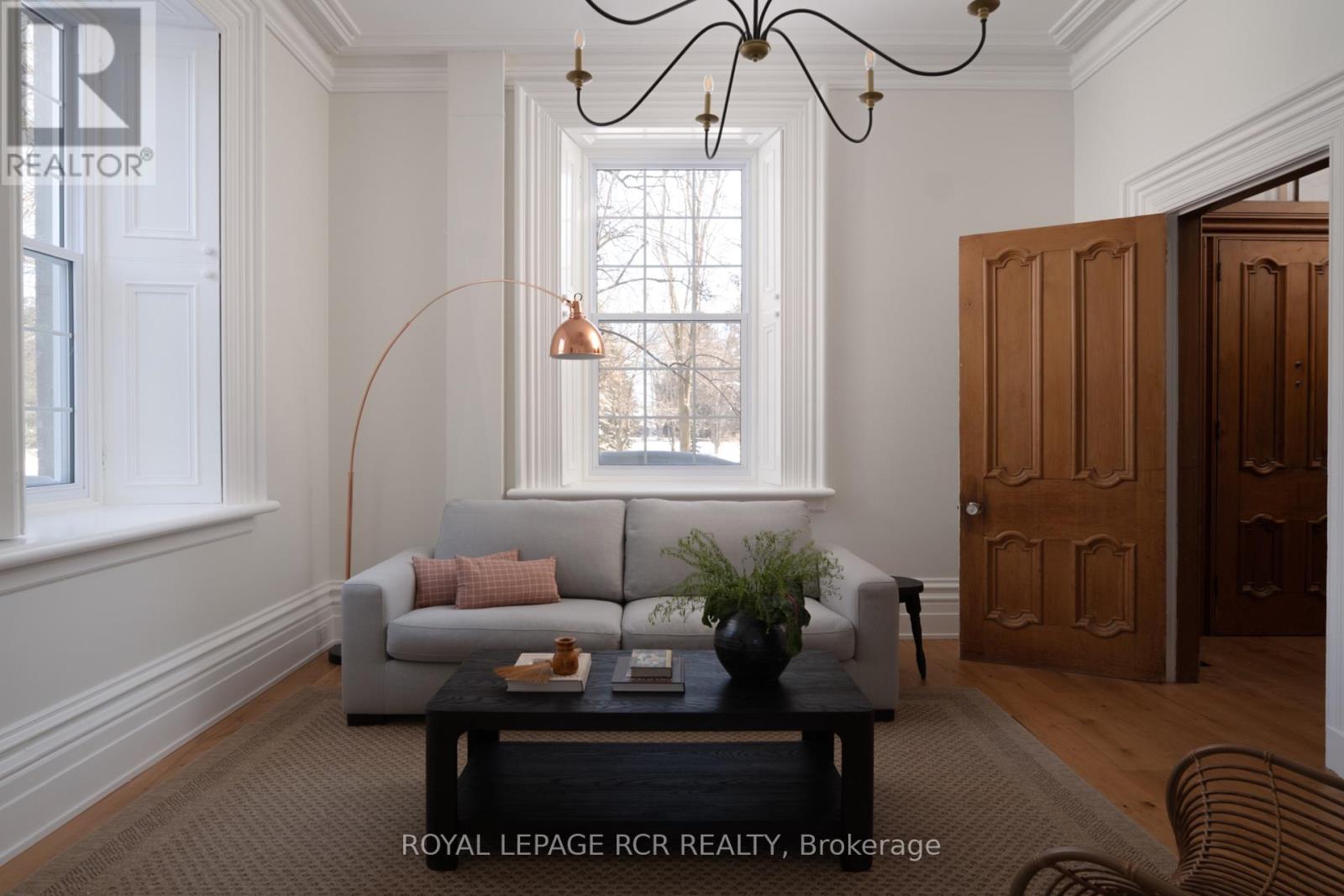 Historic soul meets a high-design heartbeat. Welcome to Stonecrop, an iconic 1857 stone manor reimagined as a warm, soulful sanctuary. Just outside of Elora, set on nearly 10 private acres at the end of a dramatic tree-lined driveway, this is a rare dialogue between historic provenance and refined organic luxury. Inside, soaring 12-foot ceilings, original plaster medallions, and dramatic stone walls create an inviting, layered atmosphere. At the heart of the home, a show-stopping kitchen, recently featured in Architectural Digest (!!!), anchors daily life and entertaining. Rooted in timeless design, it blends heritage architecture with modern precision through custom wood cabinetry, integrated top-tier appliances, and natural materials in balance. The living and dining areas continue the story, where a stone fireplace is set beneath vaulted ceilings, and skylights that flood the space with light. The main level also offers a family room, dreamy private office, and magazine worthy powder room. Upstairs, 5 spacious bedrooms span 2 levels, each defined by natural light and quiet luxury. The second floor features wide-plank wood flooring, 3 large bedrooms, and a beautifully appointed 4-piece bath. The third floor is fully finished with vaulted ceilings, exposed beams, 2 additional bedrooms, a sitting area, and a 3-piece bath. The partially finished basement offers in-law suite potential with a large bedroom, kitchenette rough-in, 4-piece bath, and separate entrance. Geothermal heating supports the home with modern efficiency. Outdoors, a heated above-ground pool, outdoor sauna, fire pit lounge, and outdoor pizza kitchen set the tone for unforgettable summers. An orchard, gardens, and private trails wind through nearly 10 acres of countryside. The impressive 58-foot detached garage includes a dedicated home gym and ample space for cars, toys, and equipment, completing this private country compound. AD-worthy interiors. Expansive acreage. Stonecrop is iconic. (id:51300)