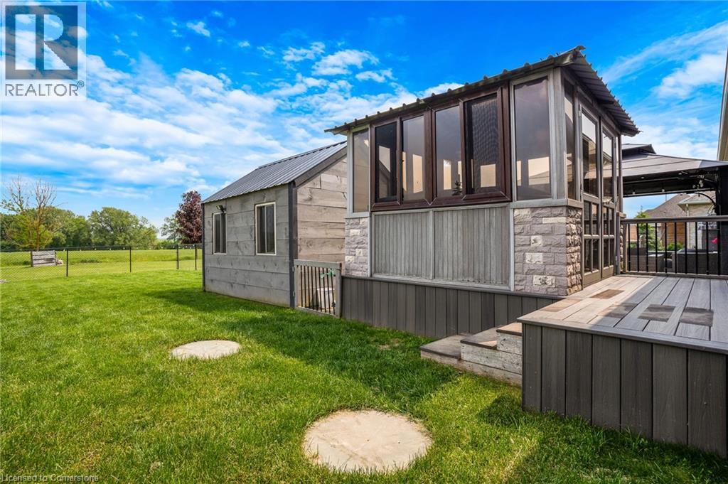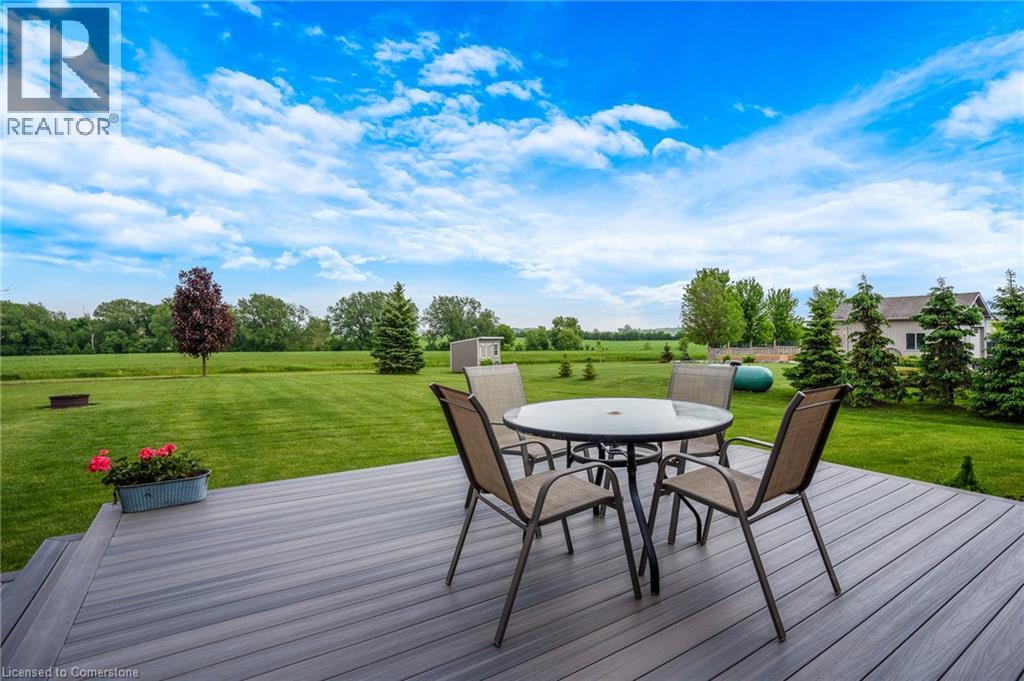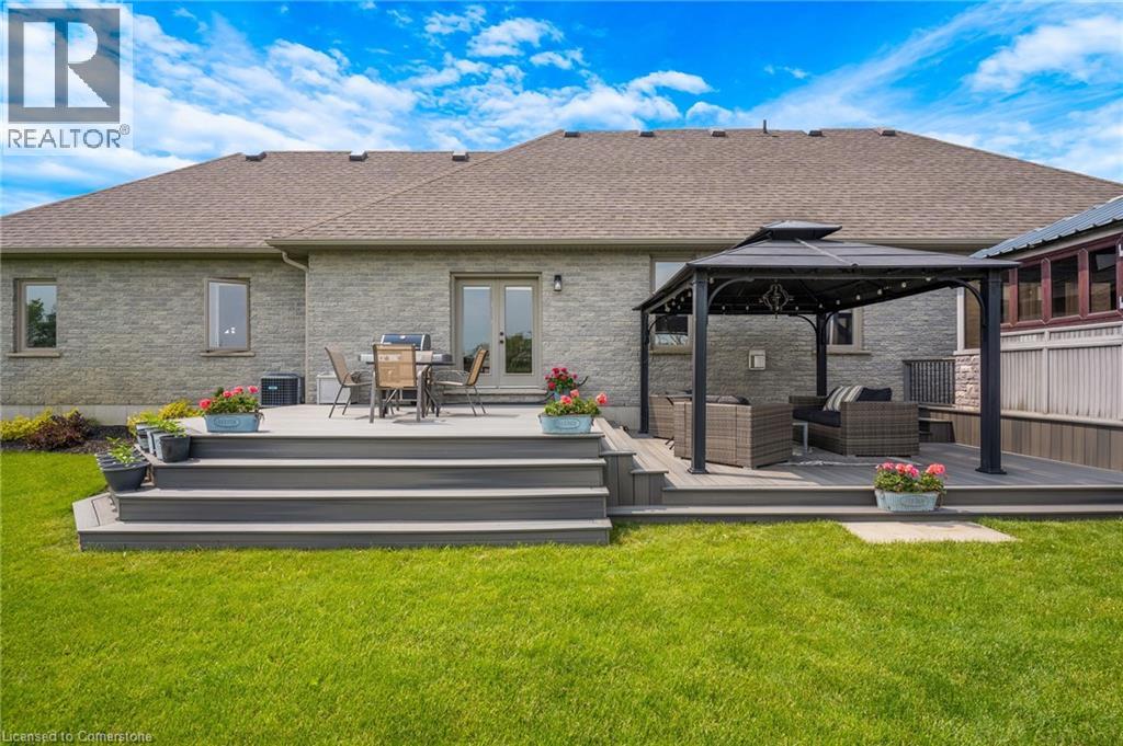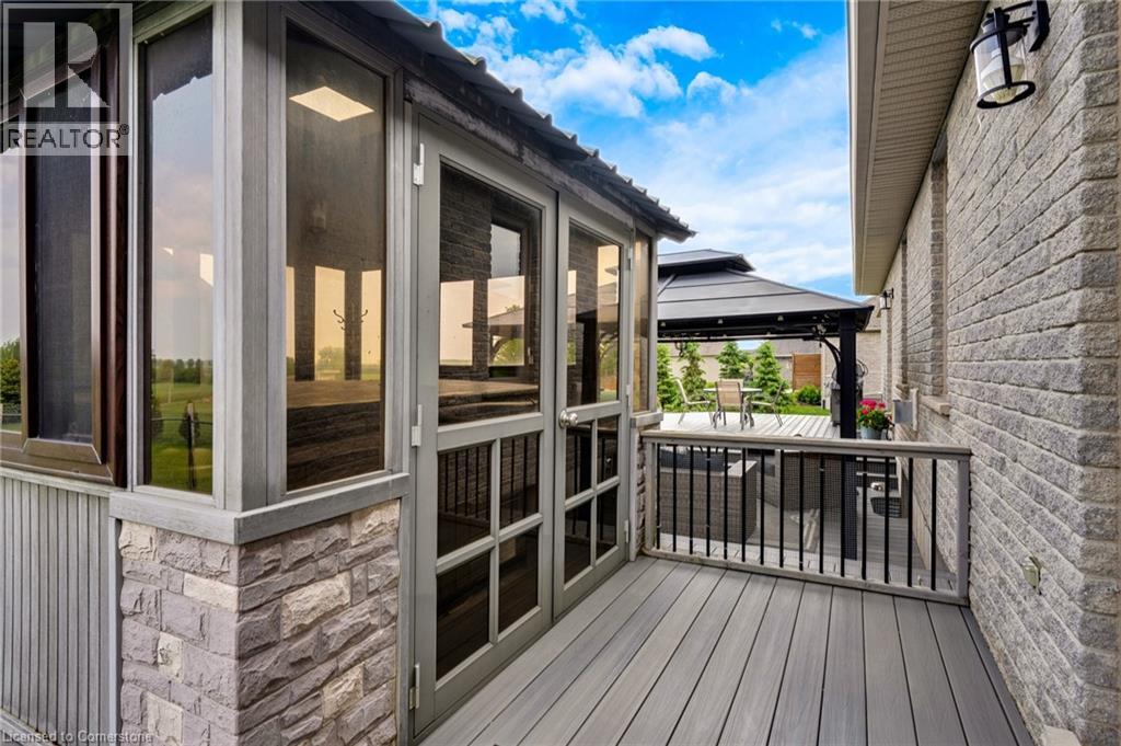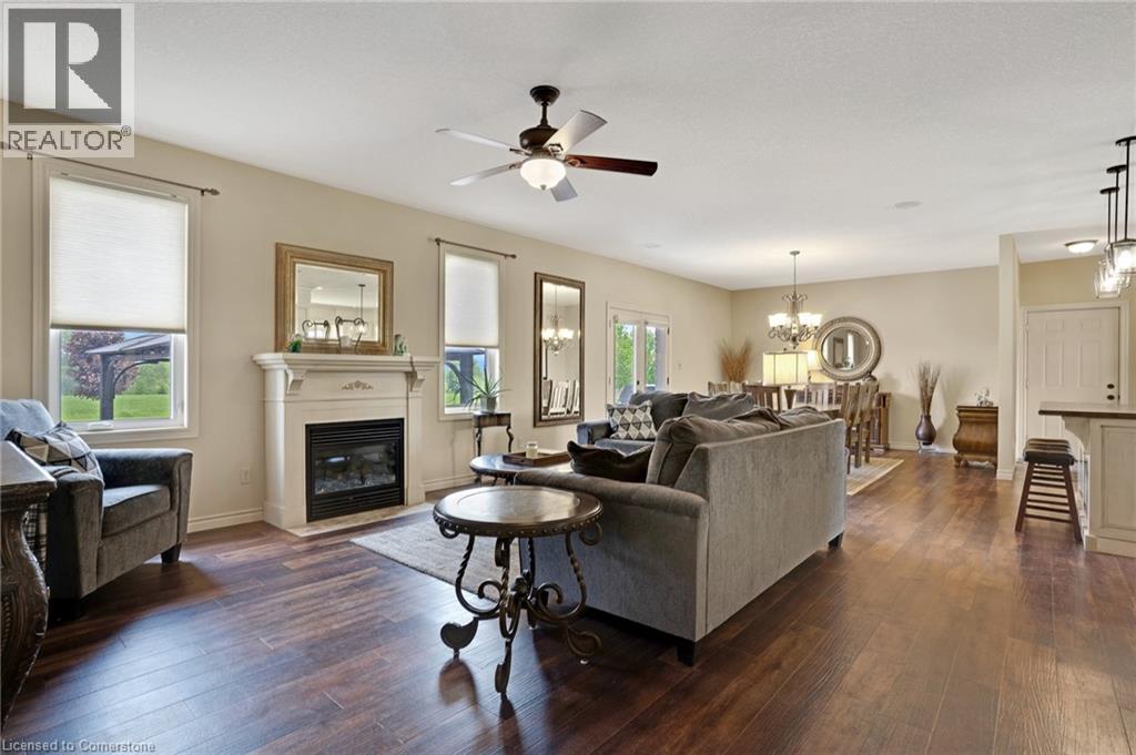 Welcome to 7829 Colonial Drive - a beautifully crafted, custom-built executive bungalow offering over 3000 sqft of finished living space nestled on a sprawling half-acre lot with tranquil farmland views right from your backyard. Step inside to a bright, open-concept main floor where natural light pours through large windows and elegant, carpet-free living creates a clean and modern feel. The kitchen is thoughtfully designed with upgraded cabinetry, stainless steel appliances, and a central island complete with a breakfast bar - ideal for everyday living or entertaining. The spacious dining area easily accommodates large family gatherings, while the inviting living room with a cozy fireplace sets the perfect atmosphere for relaxing evenings. The primary suite offers a peaceful retreat, complete with a walk-in closet and private ensuite bathroom. Downstairs, the fully finished lower level provides exceptional versatility - featuring a sprawling rec room, games area, pool table (included), fitness space, a full bathroom, and a fourth bedroom, perfect for guests or extended family. Enjoy your morning coffee and evening night cap on the oversized 16’ x 45’ composite deck, or unwind in the fully enclosed glass gazebo with a hot tub, offering year-round relaxation. The integrated 20 kW generator seamlessly powers the house in case of a power outage. The attached two car garage offers plenty of parking, storage and workspace. This home blends the calm of country life with unbeatable convenience, just a short drive to Kitchener-Waterloo, Stratford, and Listowel. If you're looking for space, privacy, and high-quality living in a serene rural setting, this exceptional home checks every box. (id:51300)