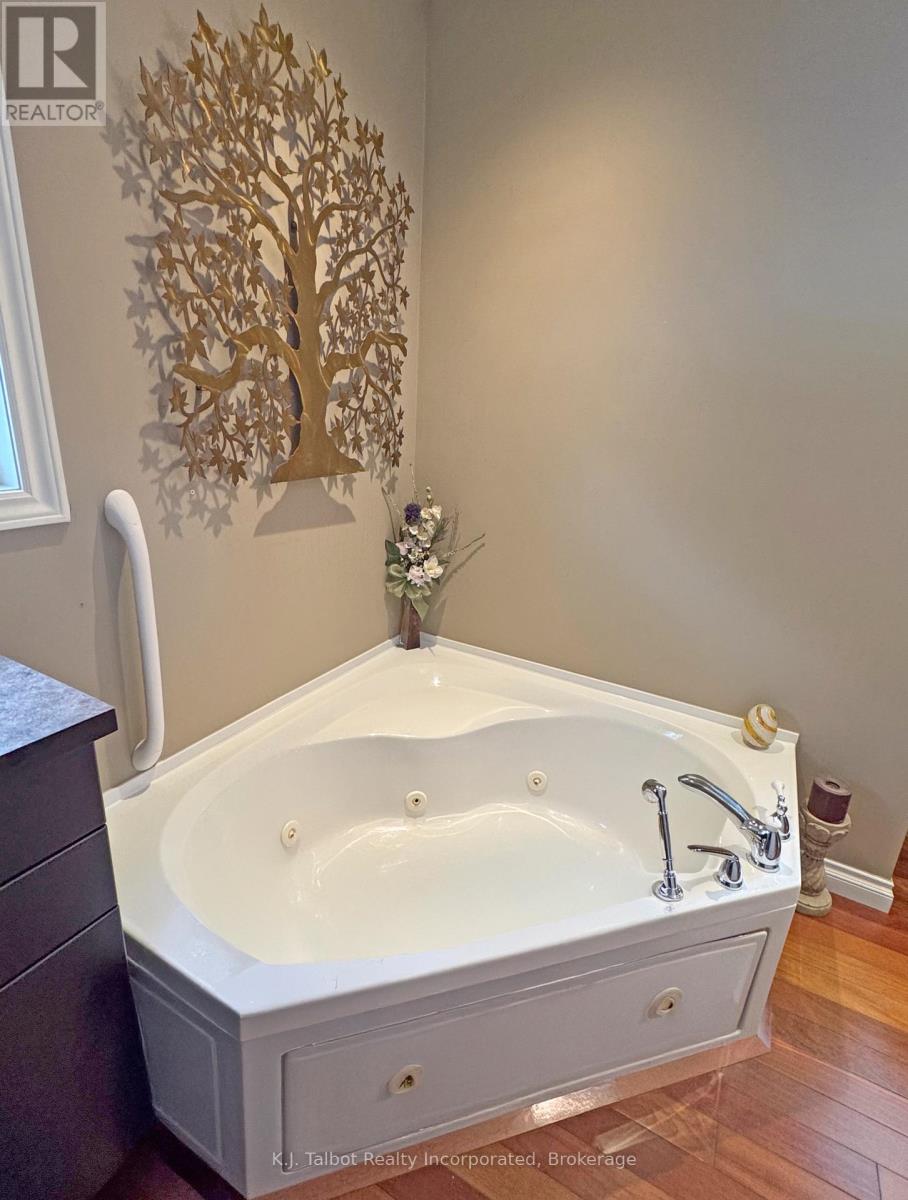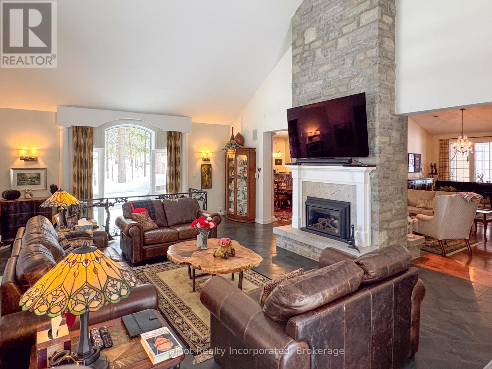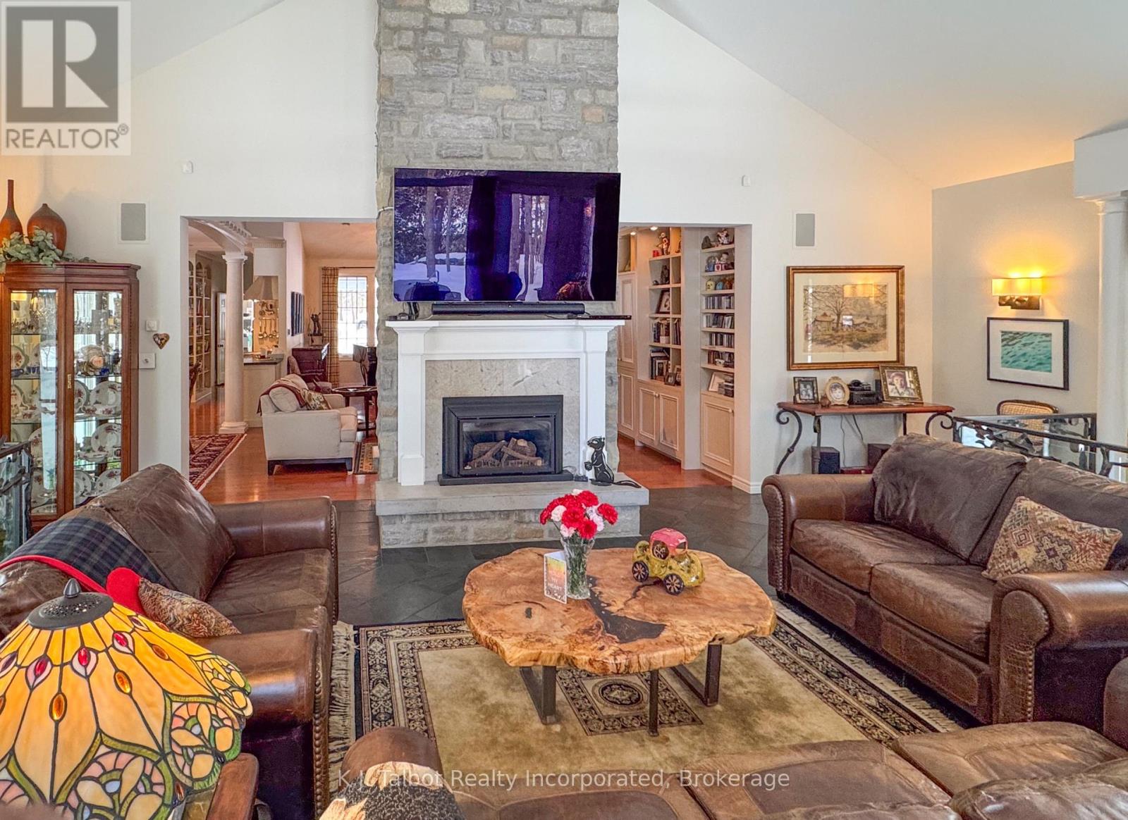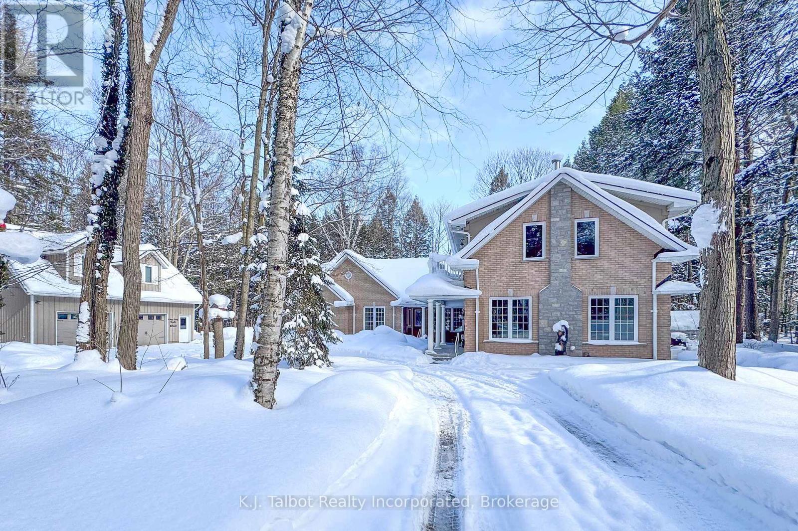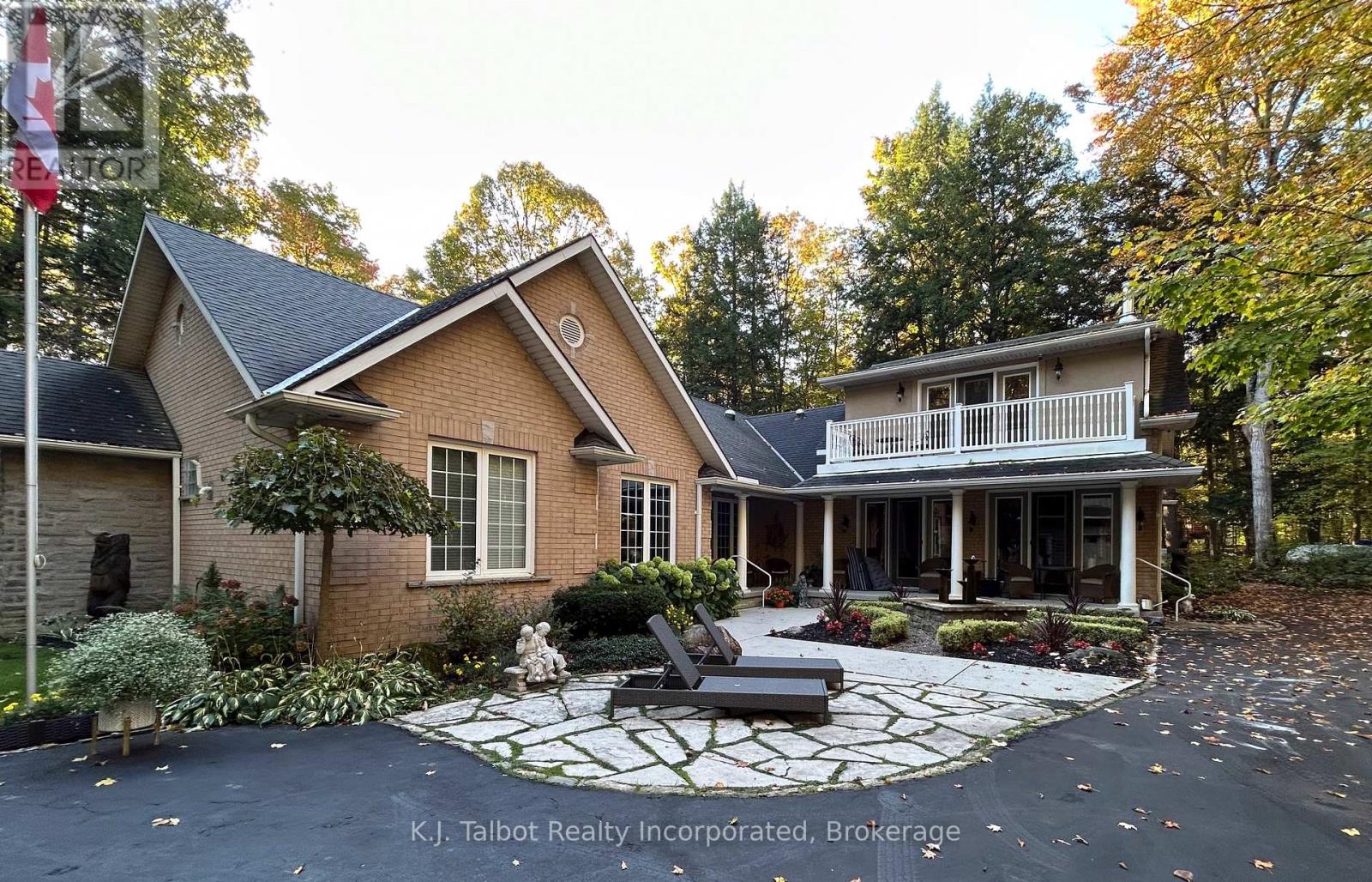 EXECUTIVE RIVERFRONT LIVING. Exceptional custom-built residence privately positioned on 4.98 wooded acres along the Maitland River, offering 230 feet of pristine river frontage just minutes from Goderich and Lake Huron. This remarkable home delivers refined main-floor living with in-floor heat and impeccable craftsmanship throughout. Elegant formal living and dining rooms are complemented by a private den/office and a gourmet kitchen designed for both everyday comfort and entertaining. The showpiece great room features soaring cathedral ceilings, expansive wall-to-wall windows capturing breathtaking river views, and a stunning double-sided cultured-stone fireplace. A main level spacious family room and lower-level rec room provide additional flexibility for family living or hosting guests. The primary suite offers a spa-inspired 5-piece ensuite complete with jacuzzi tub and steam shower - a private retreat within your own home. Outdoors, enjoy the covered rear patio framed by stone pillars overlooking the river - an extraordinary setting for year-round enjoyment. Side screened in room area offers a additional outdoor area to relax and enjoy the peaceful setting. A detached two-car garage with upper studio and an additional single-car garage provide exceptional space for vehicles, hobbies, or creative use. A propane generator backup system ensures peace of mind. A rare offering combining privacy, natural beauty, and executive-level craftsmanship - a truly one-of-a-kind Maitland River estate. (id:51300)