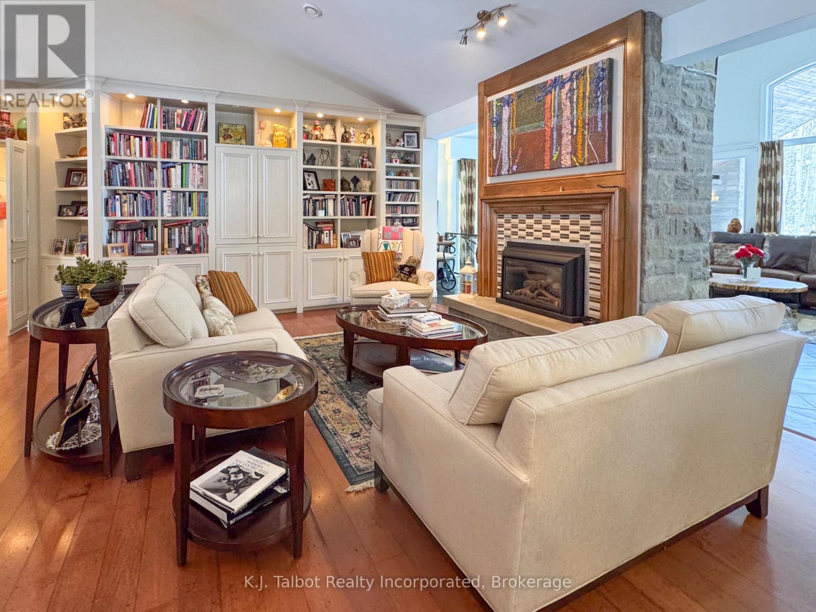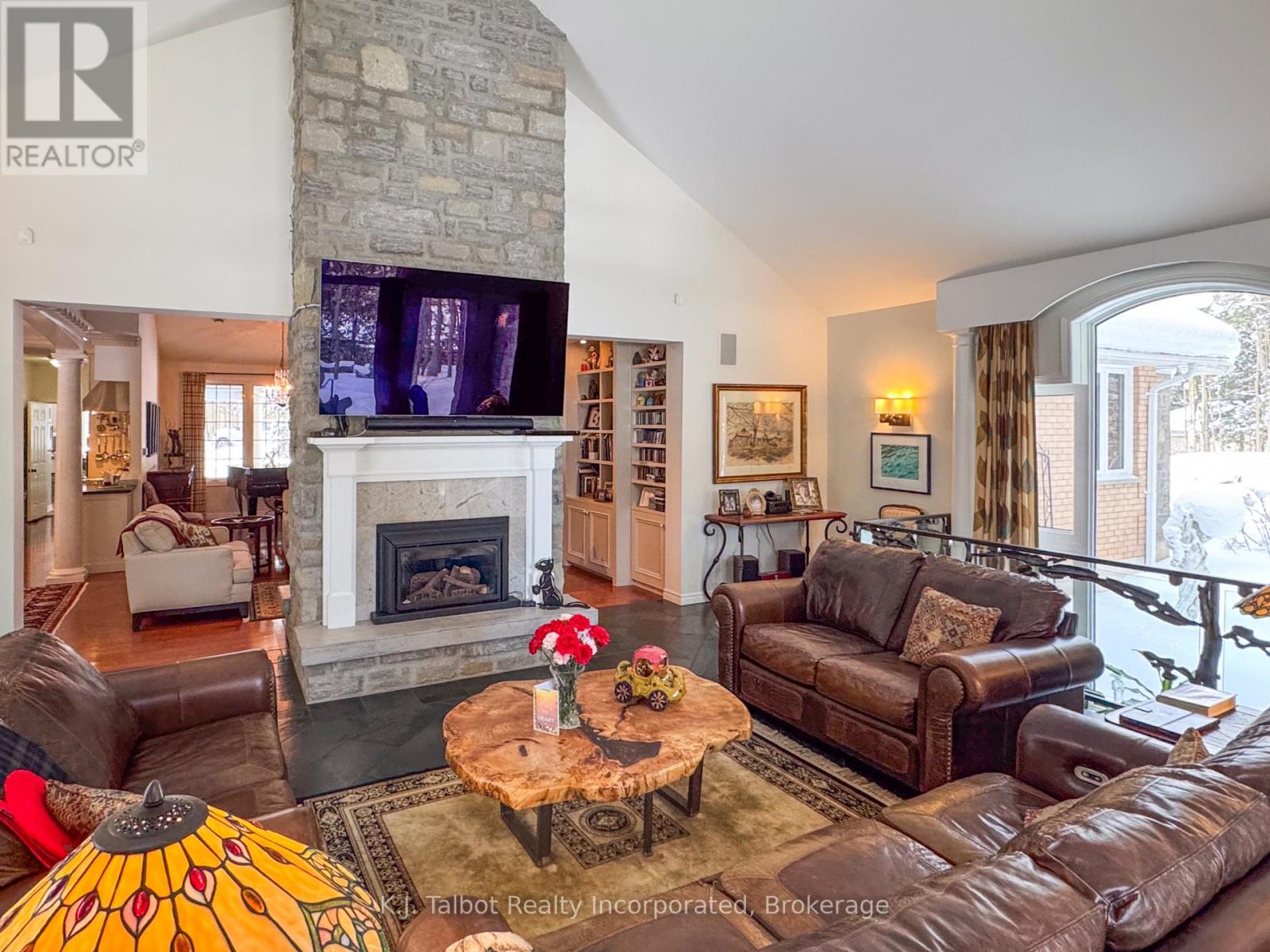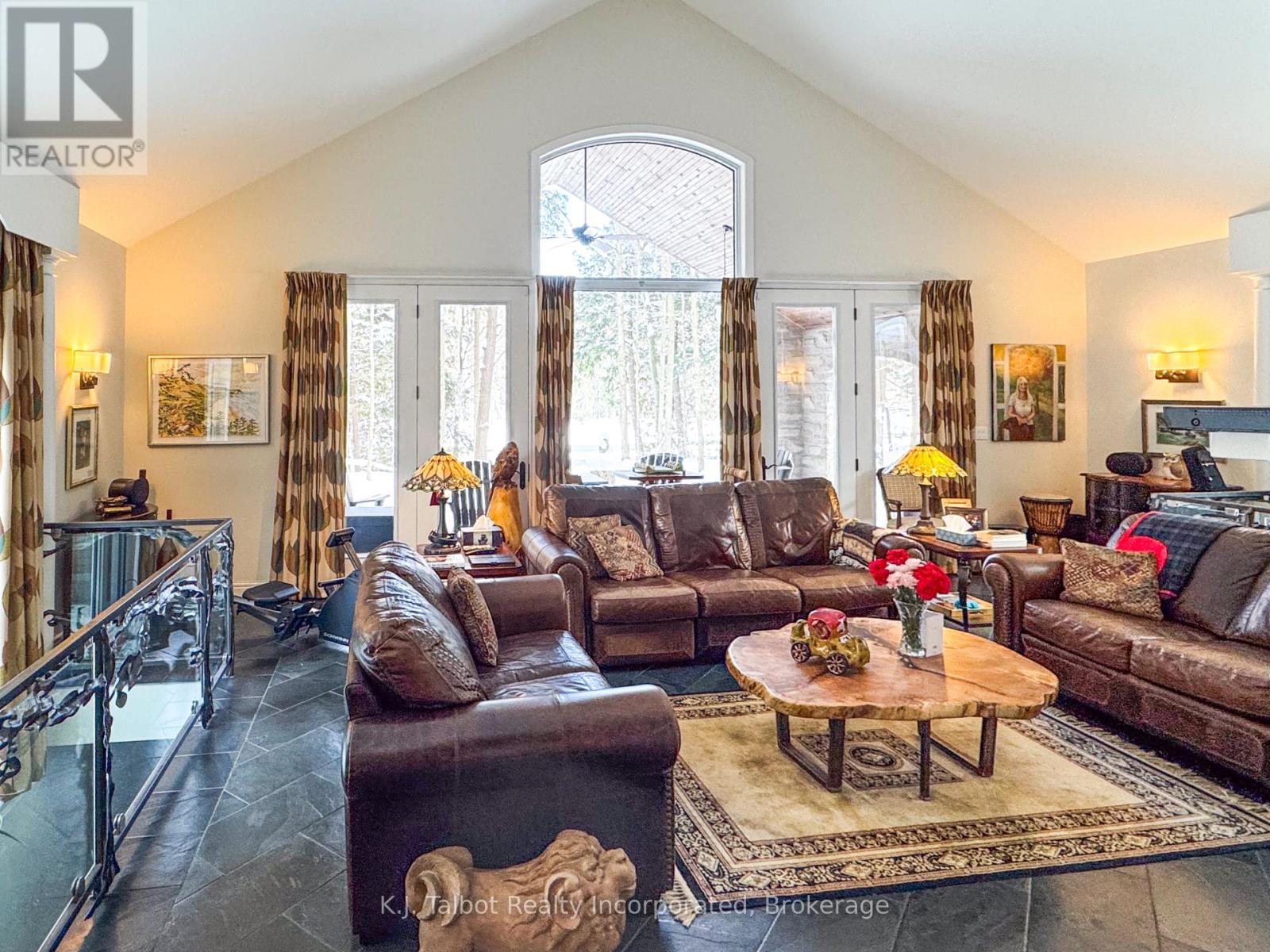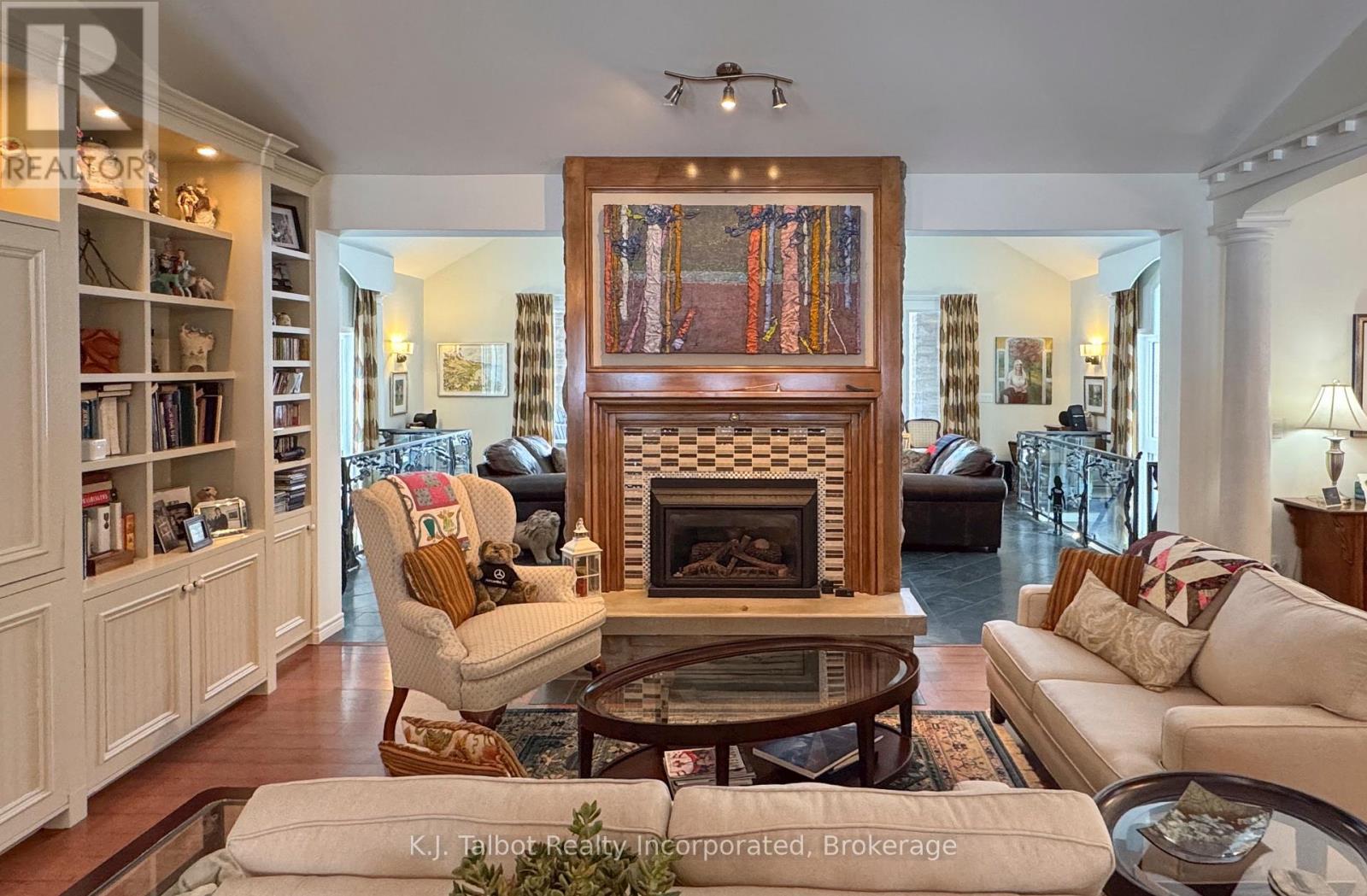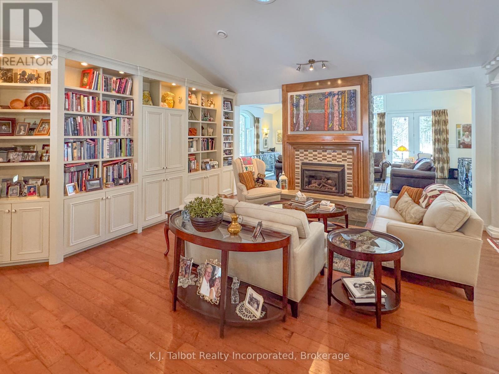 EXECUTIVE RIVERFRONT LIVING. Exceptional custom-built residence privately positioned on 4.98 wooded acres along the Maitland River, offering 230 feet of pristine river frontage just minutes from Goderich and Lake Huron. This remarkable home delivers refined main-floor living with in-floor heat and impeccable craftsmanship throughout. Elegant formal living and dining rooms are complemented by a private den/office and a gourmet kitchen designed for both everyday comfort and entertaining. The showpiece great room features soaring cathedral ceilings, expansive wall-to-wall windows capturing breathtaking river views, and a stunning double-sided cultured-stone fireplace. A main level spacious family room and lower-level rec room provide additional flexibility for family living or hosting guests. The primary suite offers a spa-inspired 5-piece ensuite complete with jacuzzi tub and steam shower - a private retreat within your own home. Outdoors, enjoy the covered rear patio framed by stone pillars overlooking the river - an extraordinary setting for year-round enjoyment. Side screened in room area offers a additional outdoor area to relax and enjoy the peaceful setting. A detached two-car garage with upper studio and an additional single-car garage provide exceptional space for vehicles, hobbies, or creative use. A propane generator backup system ensures peace of mind. A rare offering combining privacy, natural beauty, and executive-level craftsmanship - a truly one-of-a-kind Maitland River estate. (id:51300)