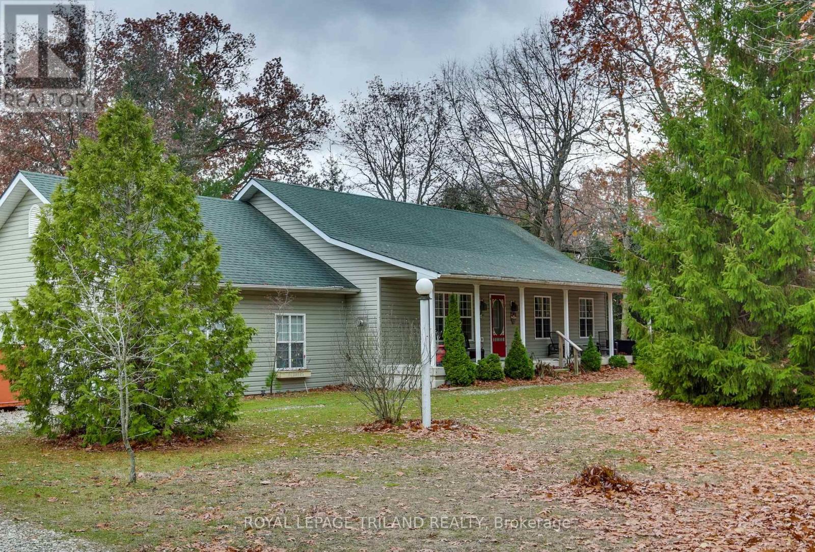 A RARE FIND! Welcome to 9909 Northville Cres. This home offers both space and serenity on a 1.5 Acre treed lot just minutes from Lake Huron, local beaches, golf and Pinery Provincial Park. This 3 Bedroom, 2 Bathroom home offers 1440 sq. ft of above grade living space, an oversized 25' x 25' attached double garage, and ample room for parking boats, RV's etc. Step inside to an inviting open-concept living area, highlighted by a beautiful, cozy fireplace and large windows that frame peaceful views of the mature property. The kitchen features custom pine cabinetry and flows easily into the dining room, which opens to a roomy back deck-perfect for bbqing, relaxing, or hosting summer gatherings. The large primary bedroom includes a private ensuite, while 2 additional bedrooms offer flexibility for family, office space of guests. Convenient main floor laundry adds to the home's practicality. A large, partially finished basement provides additional living or storage potential. Roof shingles replaced 3-4 yrs ago and eavestrough on house fitted with gutter guards. Outside hobbyists and tinkerers will appreciate the separate backyard workshop. Enjoy peaceful mornings on the large covered front porch, afternoons exploring nearby beaches and trails, and evenings soaking in the calm. Don't miss your opportunity to make this place your next home or cottage! (id:51300)