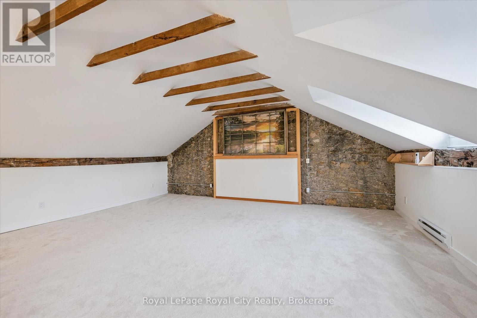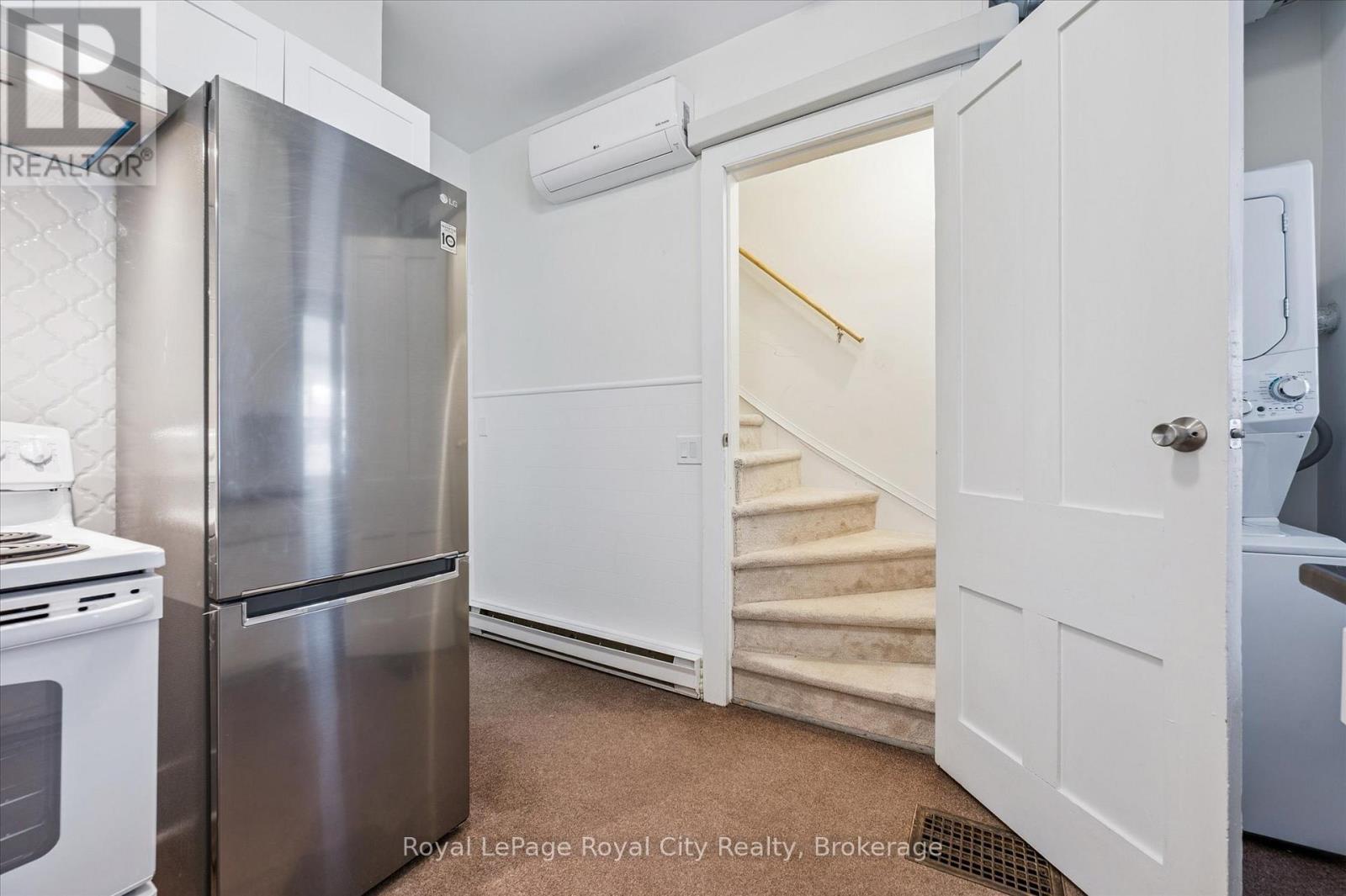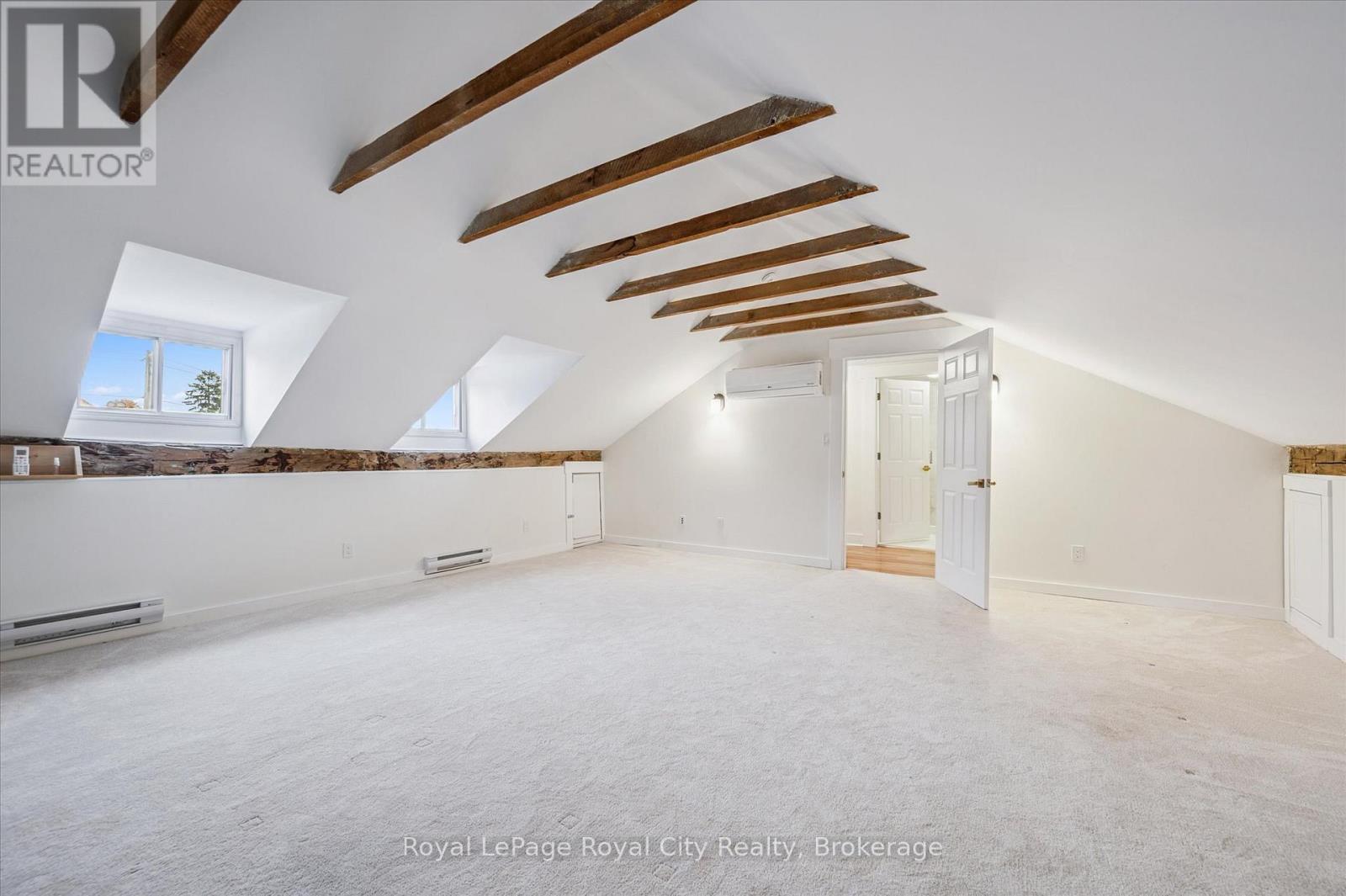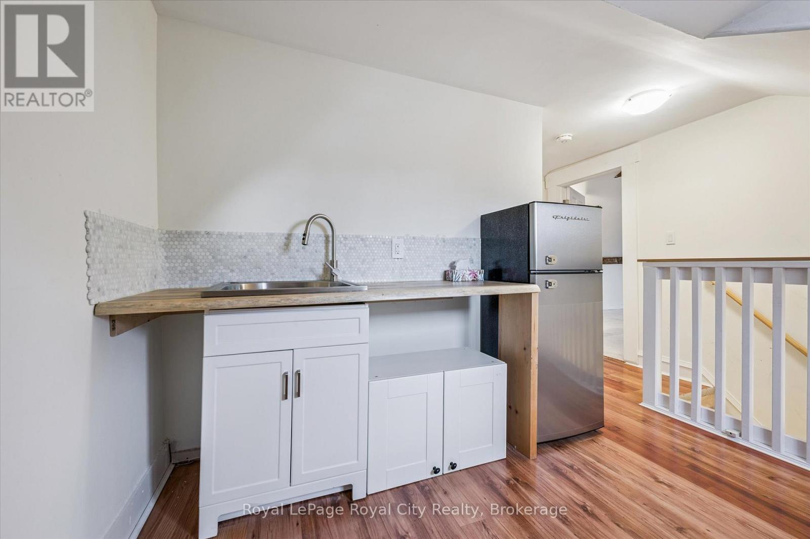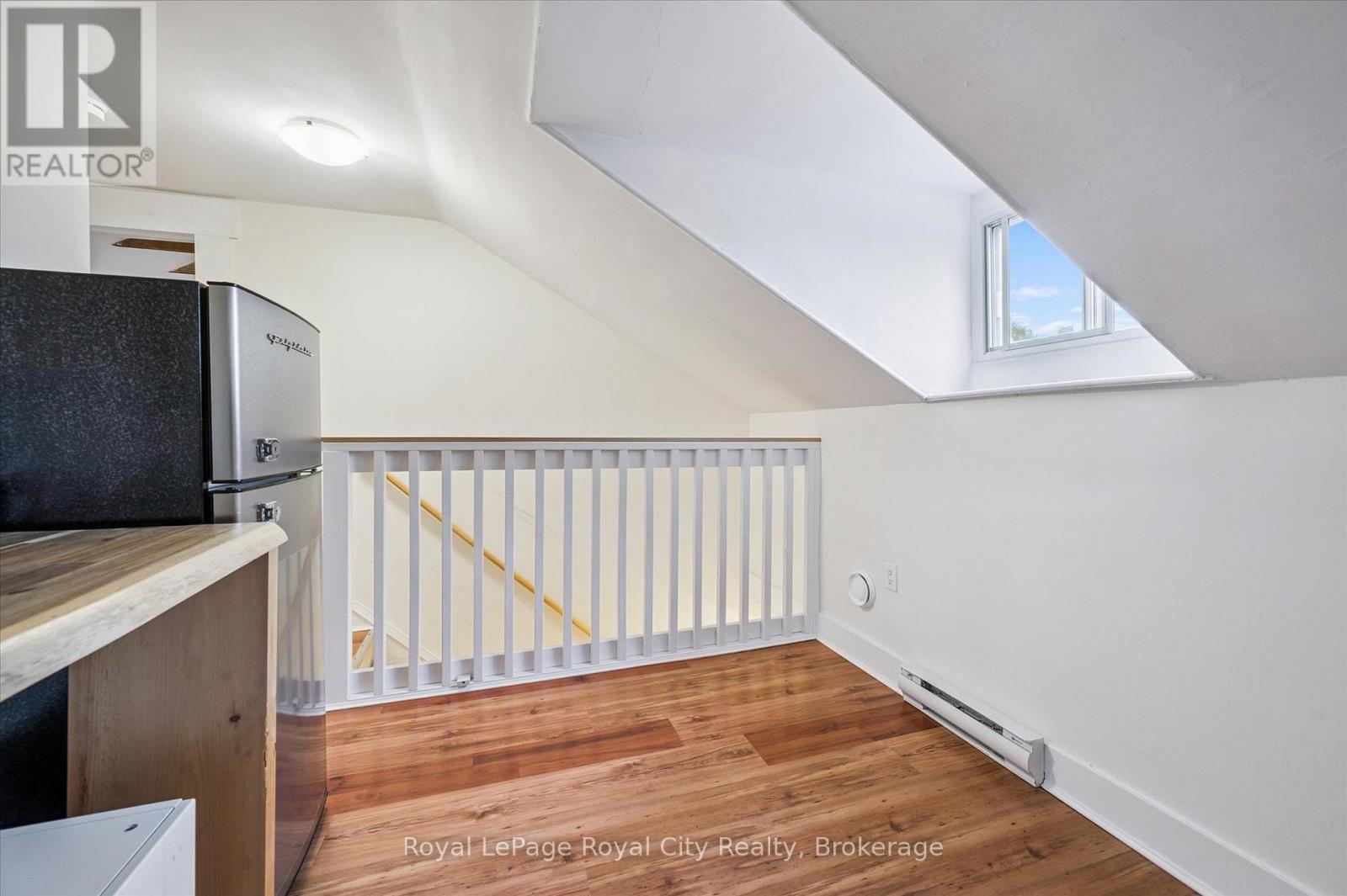 This charming two-level apartment is located in the heart of downtown Elora, offering beautiful views and plenty of character. Situated on the second floor, the unit features a recently renovated three-piece bathroom and includes convenient in-unit laundry. The upper level boasts a spacious bedroom or flex room with striking beamed ceilings, a kitchenette, and an additional renovated bathroom, providing a unique and versatile living space. One parking spot is available directly behind the building. Electricity is additional. (id:51300)