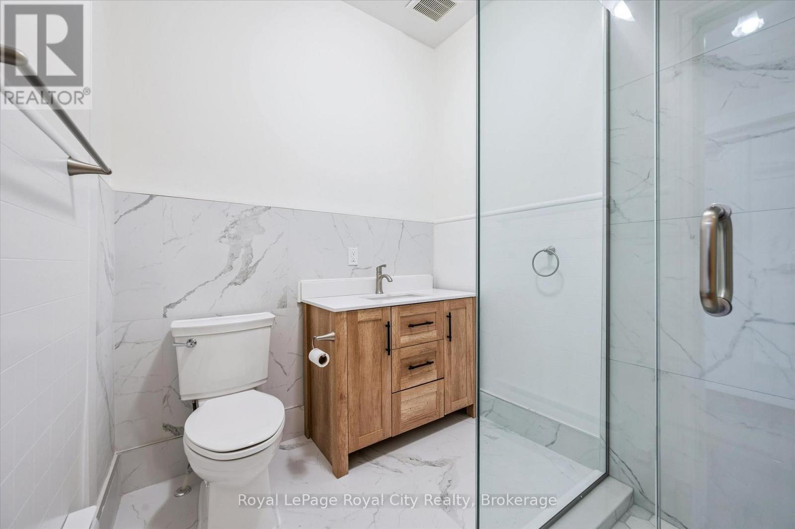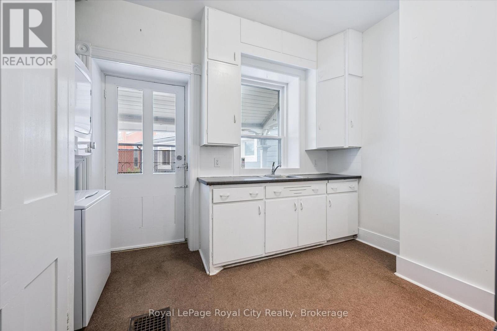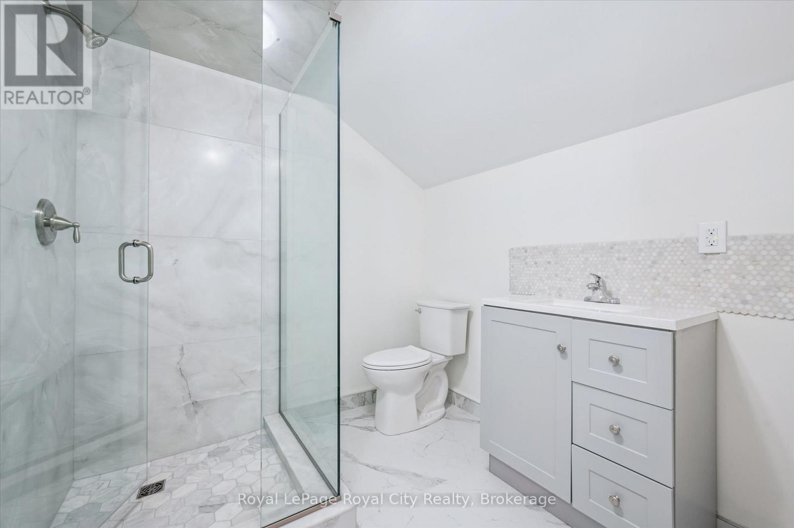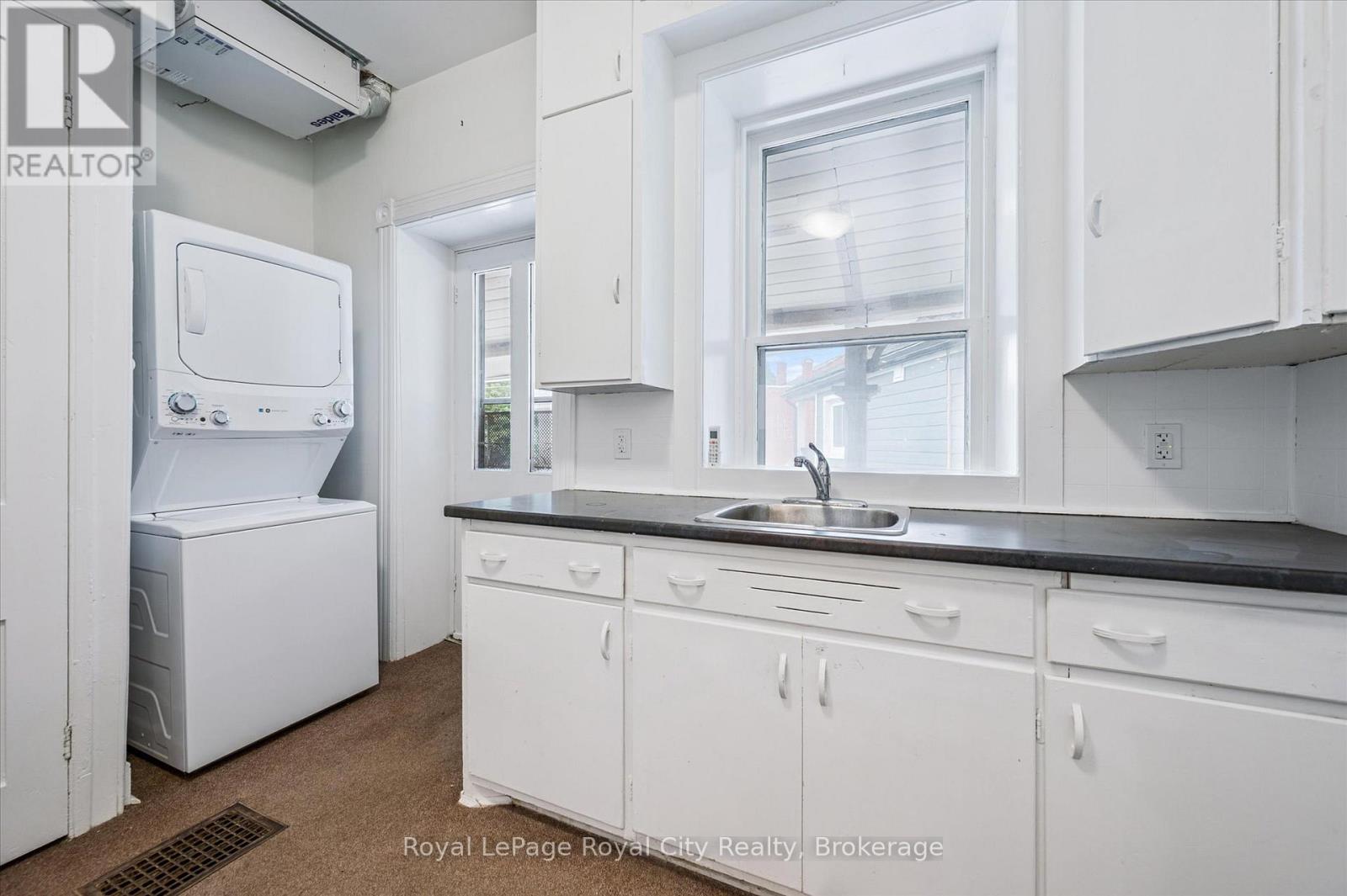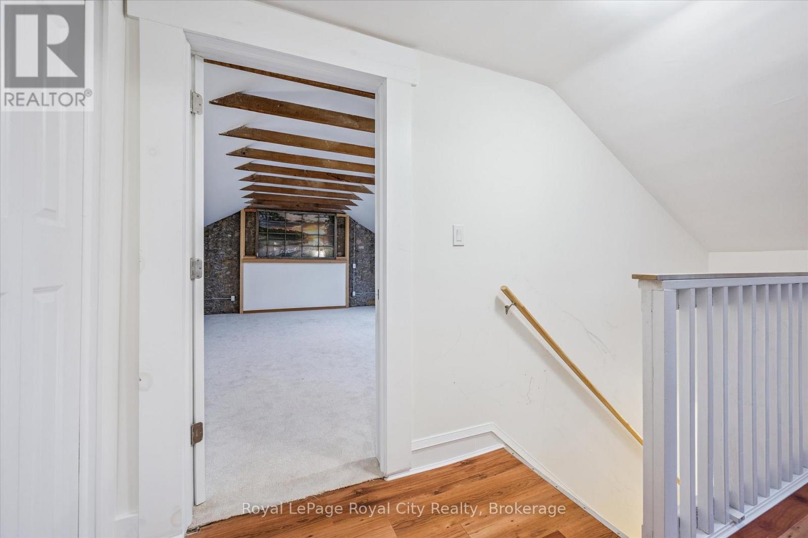 This charming two-level apartment is located in the heart of downtown Elora, offering beautiful views and plenty of character. Situated on the second floor, the unit features a recently renovated three-piece bathroom and includes convenient in-unit laundry. The upper level boasts a spacious bedroom or flex room with striking beamed ceilings, a kitchenette, and an additional renovated bathroom, providing a unique and versatile living space. One parking spot is available directly behind the building. Electricity is additional. (id:51300)