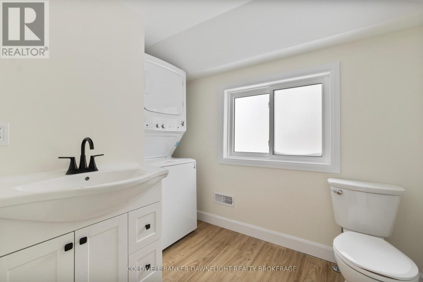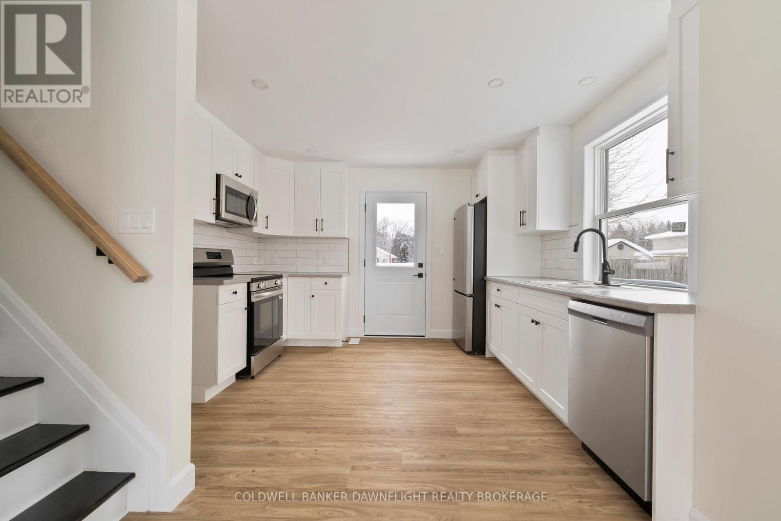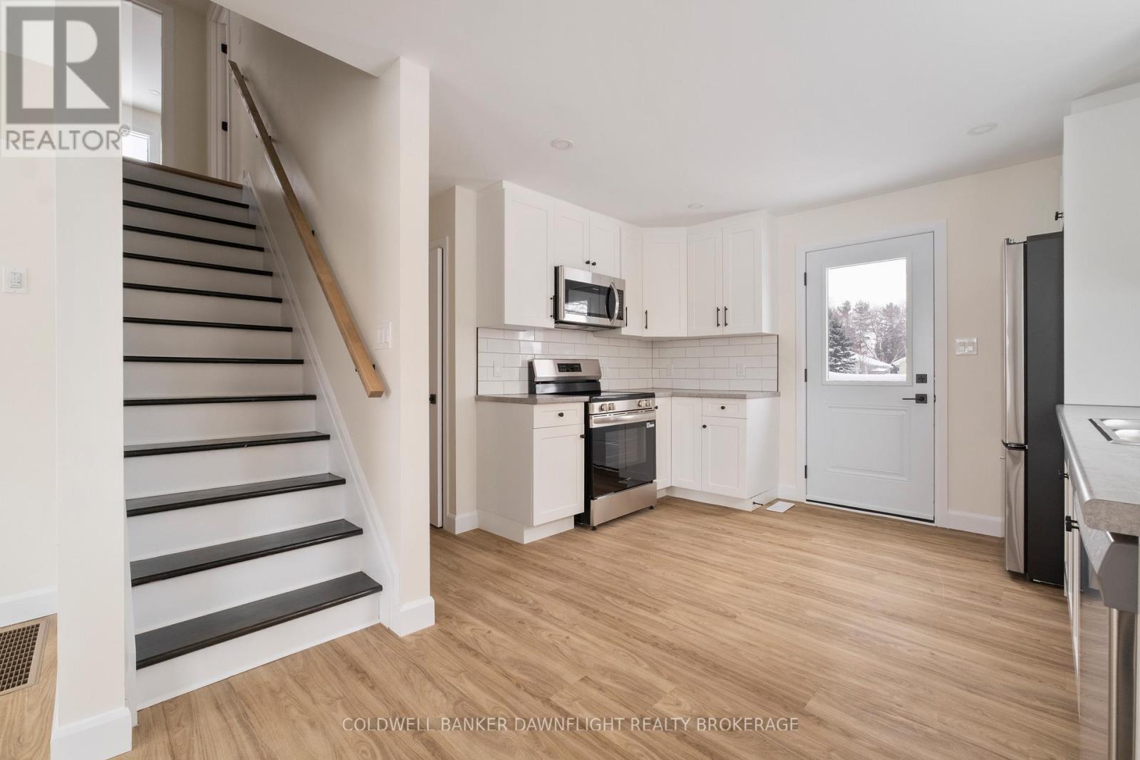 Recently renovated from the studs, this move in ready three bedroom, one bathroom unit offers modern comfort and thoughtful design. The main floor features an open concept layout with clear sightlines between the spacious kitchen and bright living area, highlighted by a large front window that fills the space with natural light. The kitchen is equipped with stainless steel appliances, soft close drawers, and a convenient pantry, with access to a small deck and backyard through the rear entrance. Upstairs, you'll find three well proportioned bedrooms, a stylish four piece bathroom, and the convenience of in-suite laundry. Additional storage space is available in the accessible basement. This unit also includes parking for two to three vehicles, providing practical benefits to complement its fresh interior. Ready for immediate possession. (id:51300)